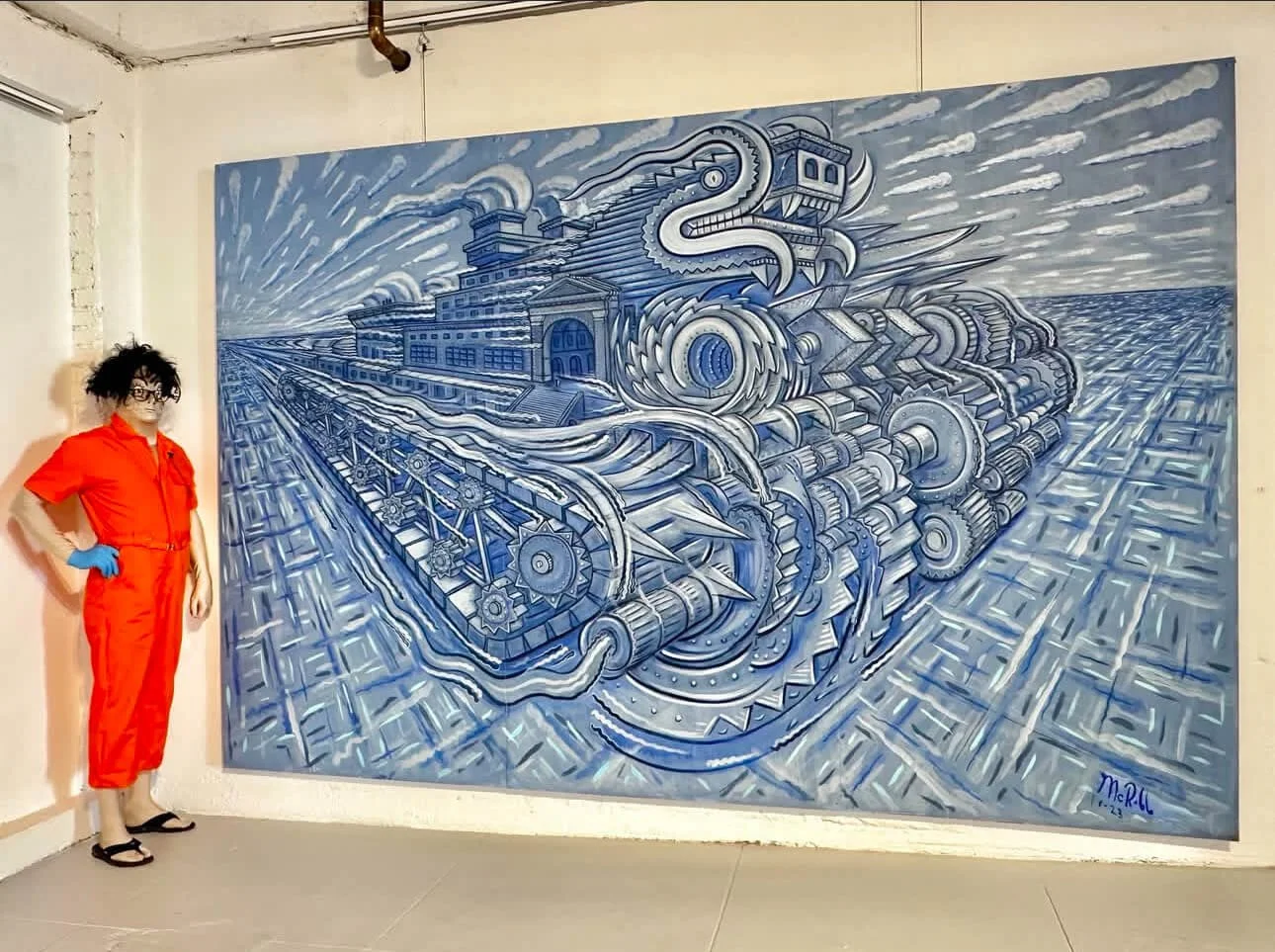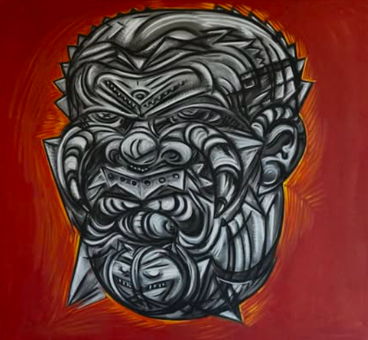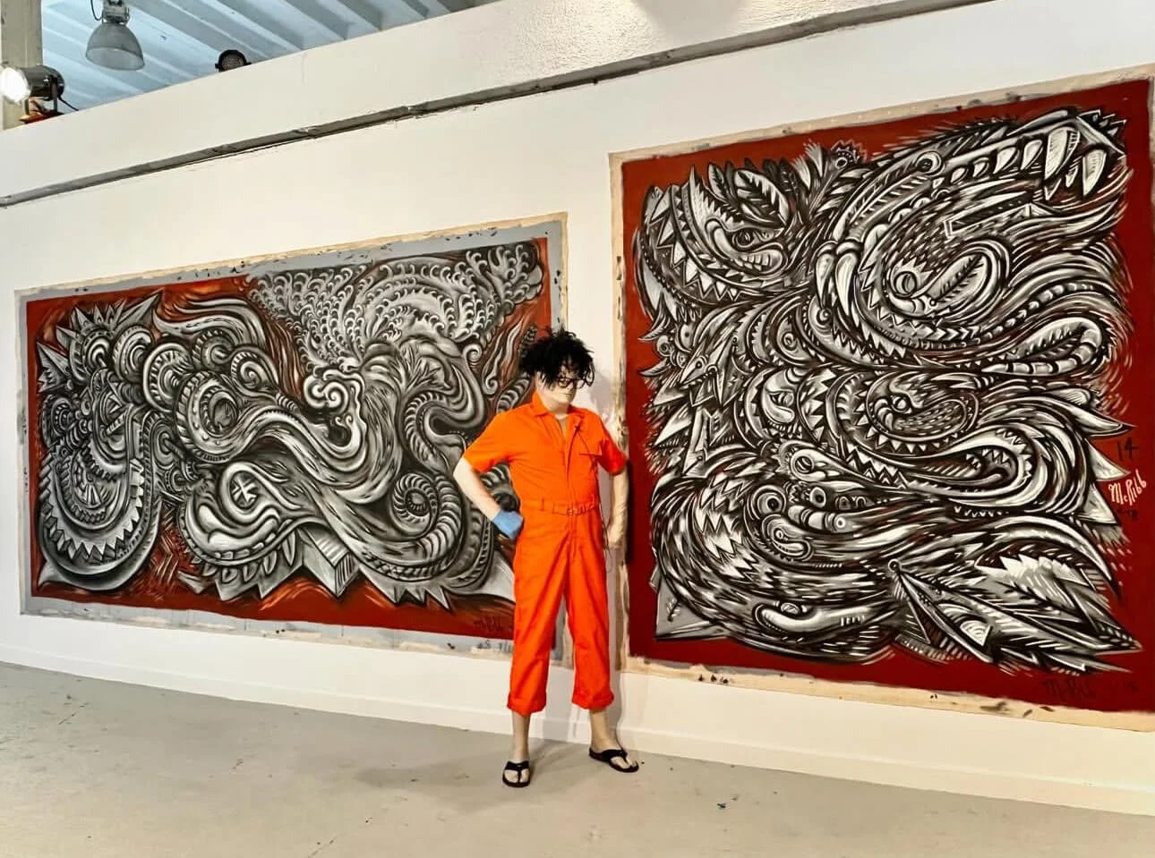 SH: So OG McRib is a guy who sort of follows me around and does paintings. So we have a symbiotic relationship. We inhabit the same body, but he's what you would call an alter ego. And the alter ego developed when I was in Los Angeles, which is the sort of like the geographic center of alter egos. People move from all over the world to go to Los Angeles in order to be the version of themselves that they weren't born as, you know, to create their own alter ego in order to live the life and get the attention that they want, or to be the dream version of themselves that they aren't in real life. And that has good and bad aspects, like anything else. It has a good aspect because alter egos are a wonderful tool to be able to experiment with different sides of your personality, and it gives you a mask to be able to do that without being judged because nobody knows who you really are. It takes a lot of confidence to go out publicly and present your art as your normal self. People are judging you based on your actual appearance and your real name and everything. So if you have an alter ego, you can bypass all of that and you can inhabit parts of yourself that you would otherwise feel uncomfortable about. OG McRib is not obligated to be nice to anybody. He's not obligated to have opinions that please people. But OG McRib has an obligation to create really banger works of art, really important, huge, loud paintings that are good.