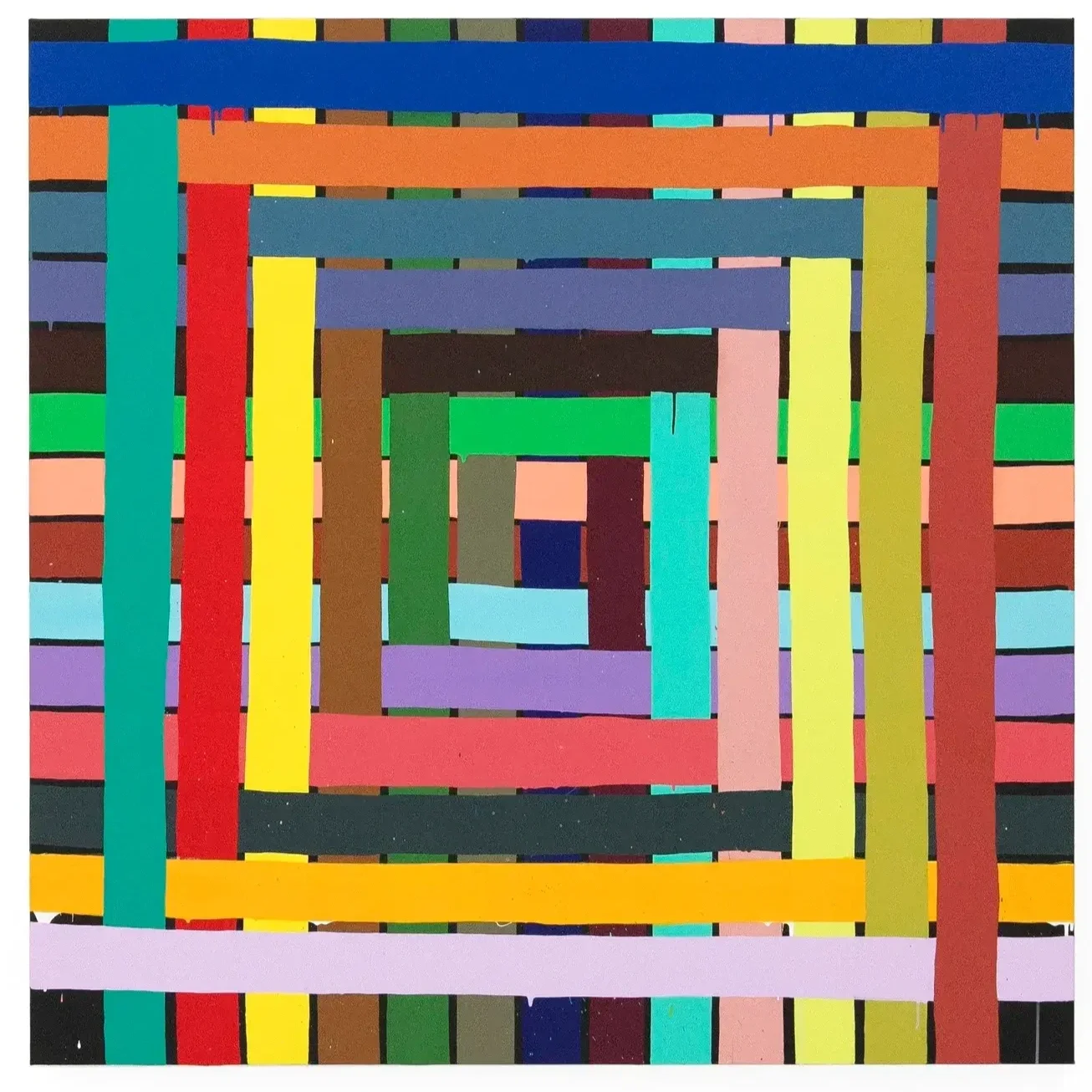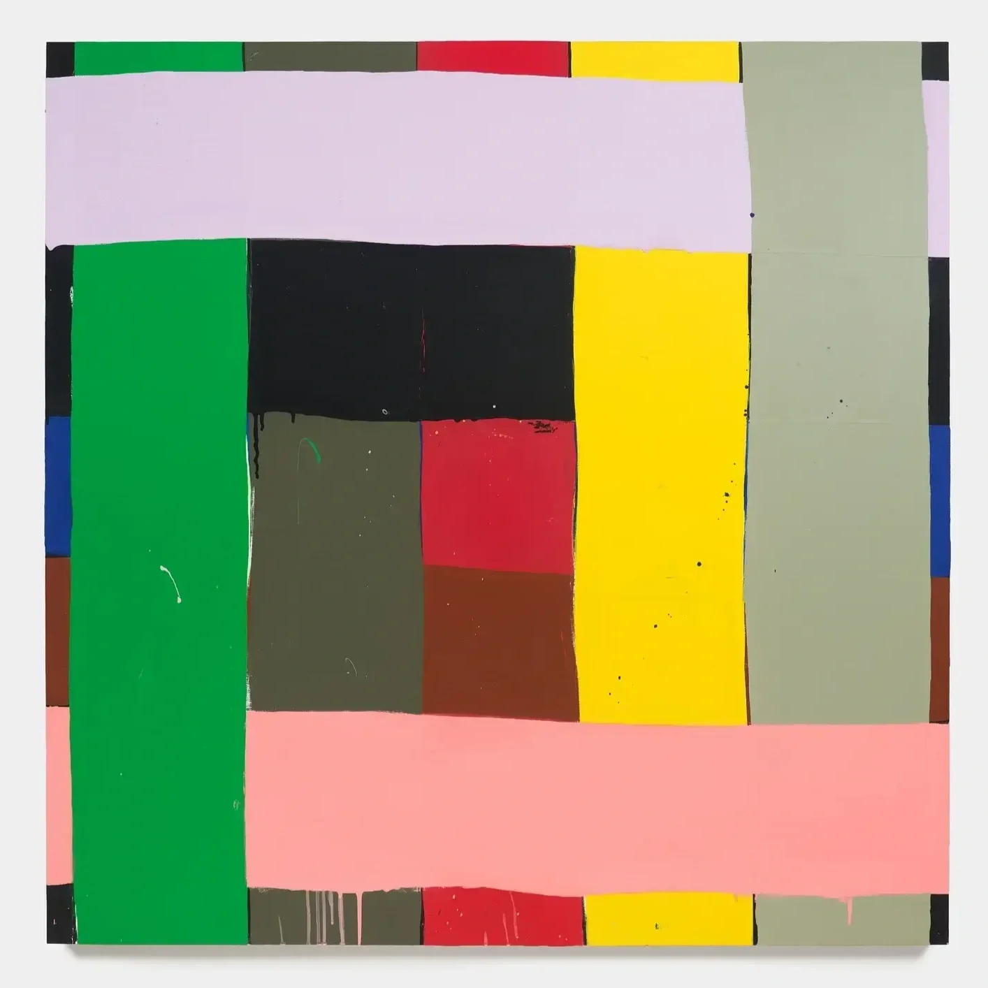 Alicia McCathy presents four large works on canvas and wood in her most recent exhibition at pt.2 Gallery. The paintings consist of colorful broad, partial, weave-like patterns and range in size from 48 x 48 inches to 72 x 98 inches. The medium is latex, acrylic, and flashe vinyl. Each is from a distinct year from 2022 to 2025. A number of visual properties immediately leap out toward the viewer including vibrant paint bands and a seemingly grid or labyrinth like formalism that nevertheless celebrates the imperfection of the human hand. These are not taped off hard edges, but rather slightly oblique line sequences that incorporate, and even celebrate, drip patterns. Insecurity is avoided as authenticity overrides any insistence on rigid doctrine. These are not clumsy or hesitant lines either. The boldness of wide-color swathes combine with an insolence against perfection. The lines themselves imitate movement; they animise, just as if the visual markers are breathing. McCarthy’s work poses the question of how nonobjective art can bind us, and whether there is something in how we engage these works that unifies us?