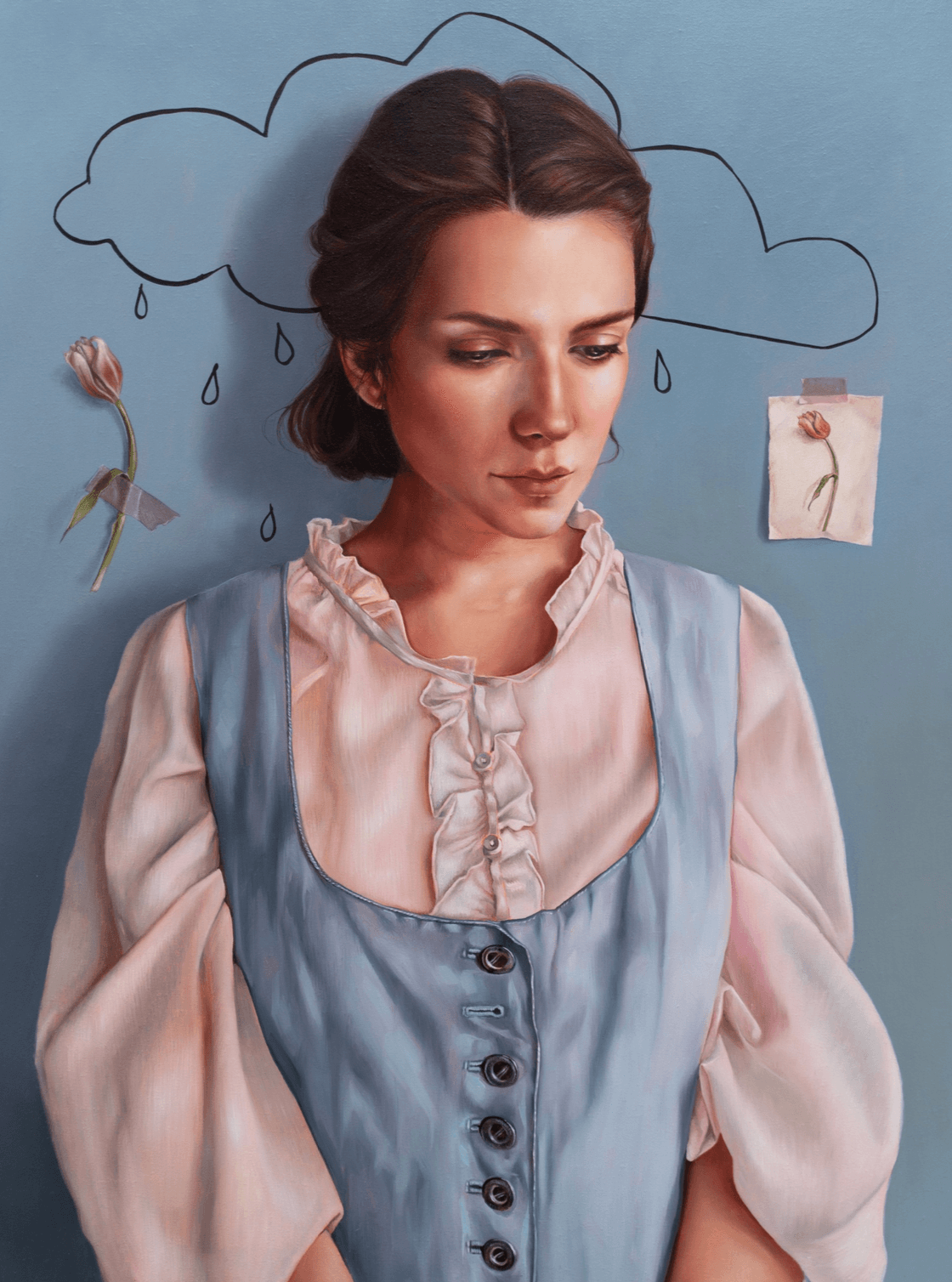 Ultimately, Monteiro’s focus on melancholic sentiments in her self-portraits, downcast portrayals, and tight-lipped renderings raises questions about how the unportrayed emotions affect us. In philosophical circles, the privation theory of evil is the doctrine that evil is merely the absence of good. It undermines the idea that evil exists on its own and essentially presents good as the foundational value. In other words, something not present can exist and is paramount to what is shown, even when it isn't overtly spoken about. Is there a privation theory of emotions in Monteiro’s work? Ultimately, Monteiro's doleful presentations seem to suggest, and even allude to, felicity through its absence in these paintings. Vignettes representing youth and sentimentality give these works a hint of nostalgic joy and playfulness, emphasizing the distinction between representation and actual truth.