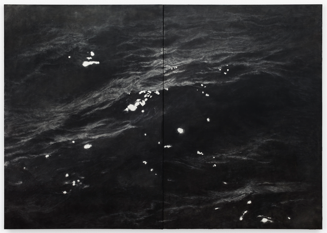 Take Alexander Zhu’s Hadal (2025), the first work one encounters on entering the gallery. It is a larger-than-life diptych representing a fragment of ocean through the medium of charcoal on canvas. What the viewer sees are reflections of light and the careful modulation of tone that suggests the architecture of waves. What looks like a painting is actually a drawing, and it represents what a slice of ocean would look like at one moment in time, as if caught by a photograph. There is duplicity here—a painting that looks like a photograph but is actually a drawing—but to call this work illusionistic misses the mark. One encounters a uniquely crafted visual experience that appears familiar, yet the more one examines it, the more the conventions that undergird it seem to fall apart. If it captures a moment in time, why does it take so long for a viewer to figure out what she is looking at? It is a large and highly-detailed drawing with bravura technique, alluring and fascinating as an object in its own right.