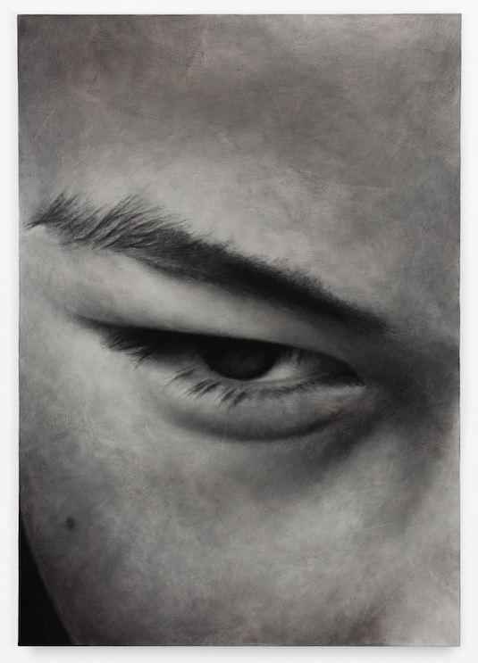(L) Alexandre Zhu, Please turn off all electronic devices, 2025, Charcoal on canvas, 39 3/8 x 27 1/2 in (R) detail