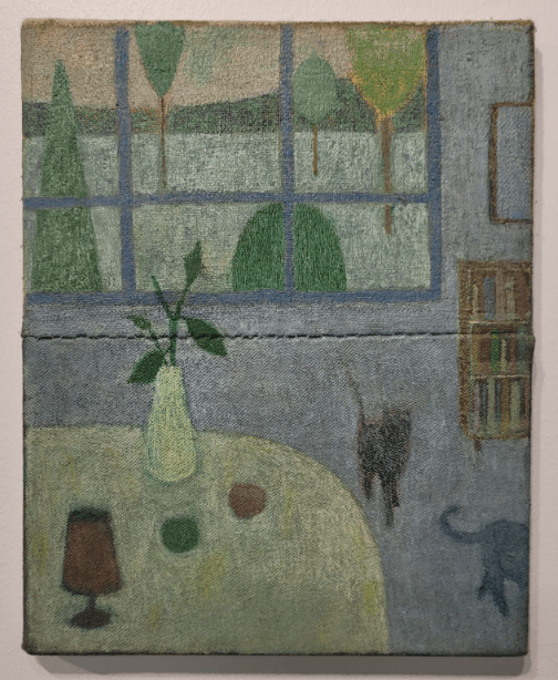 The pensive atmosphere turns playful in When the Parents Away, the Cats Will Play as cats in soft silhouettes walk across the picture plane. Bonnard added cats to several of his paintings, lending his interiors a relaxed tone. Cabrillo Jacobsen performs a similar act through the cats to challenge the room's muted blues and softly shaped landscape under the dusky light of the sky seen past the wood slats of a window that leaves a lingering sense of contemplating change. Contemplative atmosphere aside, the cats, the title, and division of space between floor and wall created by a sloping seam in the canvas along with Cabrillo Jacobsen's flower vase from which two stems emerge sits all too close to the table's edge alluding to mischief indicating a story that sits untold with the books on the painting's shelf.