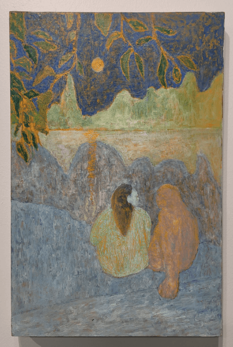 In Moonwatching, the room, its doors and windows left behind, underpainting's orange peeks from beneath a blue-purple sky, highlighting the moon's glow around the edge of leaves. Two figures in conversation, perhaps the fading memory of a first kiss, a distant horizon, and rising moon reflect across the water, story intimately interwoven with memory recalls Oscar Wilde's play The Importance of Being Earnest in which Algernon Moncrieff says, "Memory... is the diary that we all carry about with us."[2]