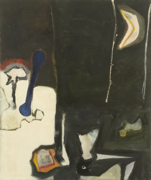 Entering the gallery doors, I'm immediately met with a sense of how finite time is. I begin my viewing chronologically, coming to an oil titled Objects Above and Below the Horizon (1947). The composition is split along the waistline and feels like you’re standing on the edge of a cliff. The application is carefully loose. Drawn to the upper half, I look out as a blue day cuts and blends through hovering forms. They dance and hide and push against the picture plane. Below lies a foggy labyrinth of earthen tones that recede up and out into space. It’s hard not to see a body of water as my eye is guided back up to the ‘horizon’, twisting back to life.