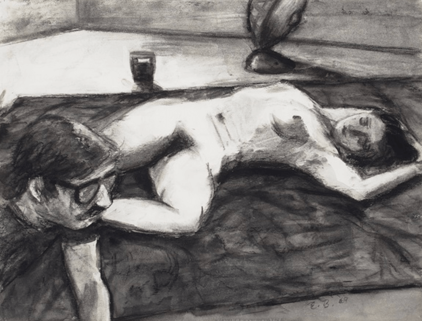 There are 11 pieces in the show that were made on paper. Across them there’s ink, graphite, charcoal, watercolor and collage. All of these pieces bring focus to the craft and rigor shared by a group of artists fascinated by what the figure could hold. This is particularly evident in the scenes Bischoff depicts of other artists sketching the model.