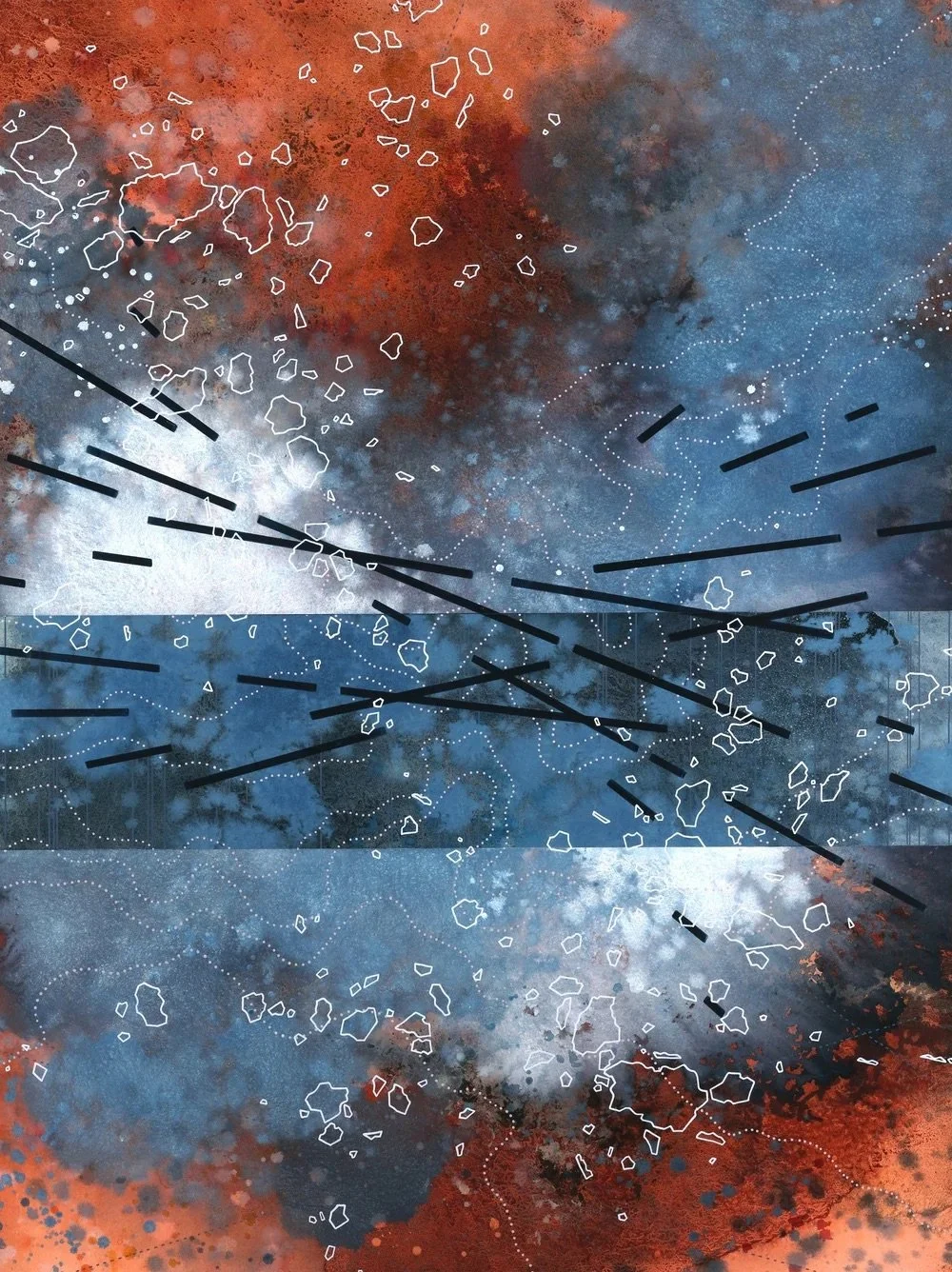 Kairos takes the exhibition into abstraction, and it works because her process is rooted in the same impulse that drives the other two: go to a place, spend time there, translate what being there felt like. She talked about working in the Mojave, building up an ambient awareness of a place over many visits rather than painting any single view of it. Her paintings begin as improvisational ink drawings on paper, then get mounted to panel and finished with acrylic. The results carry the language of maps and topography, shapes that could be a macro view of a coastline or a micro view of cracked desert ground. Diagonals and crisp interruptions in the picture plane suggest shifts in altitude or time. Color, she told me, is emotional: it corresponds to where she was with the painting, not a literal description of terrain. Threshold sits between landscape and memory, and the longer you look, the more those two things blur.