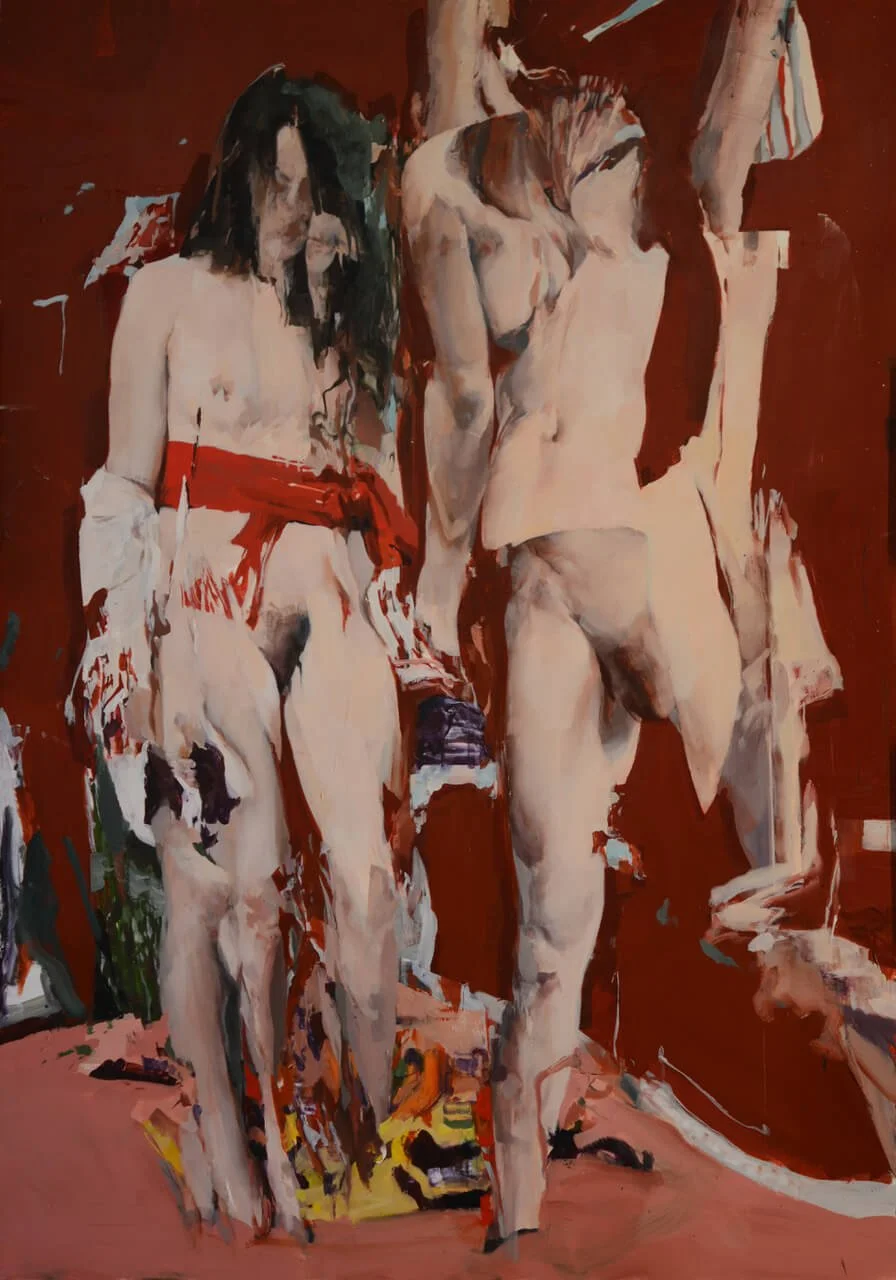 People in Red Interior makes that shift explicit. The red is immediate and almost confrontational, pulling the scene apart before the figures even settle. The bodies drift, but the room does too, and that mutual instability creates a kind of internal pressure. Planes jump forward; others recede or break. There’s no single point of resolution. Instead, the painting feels like an image trying to assemble itself in time, and refusing to force the issue. Kanevsky lets the painting reveal the thinking behind it, even when the thinking contradicts itself.