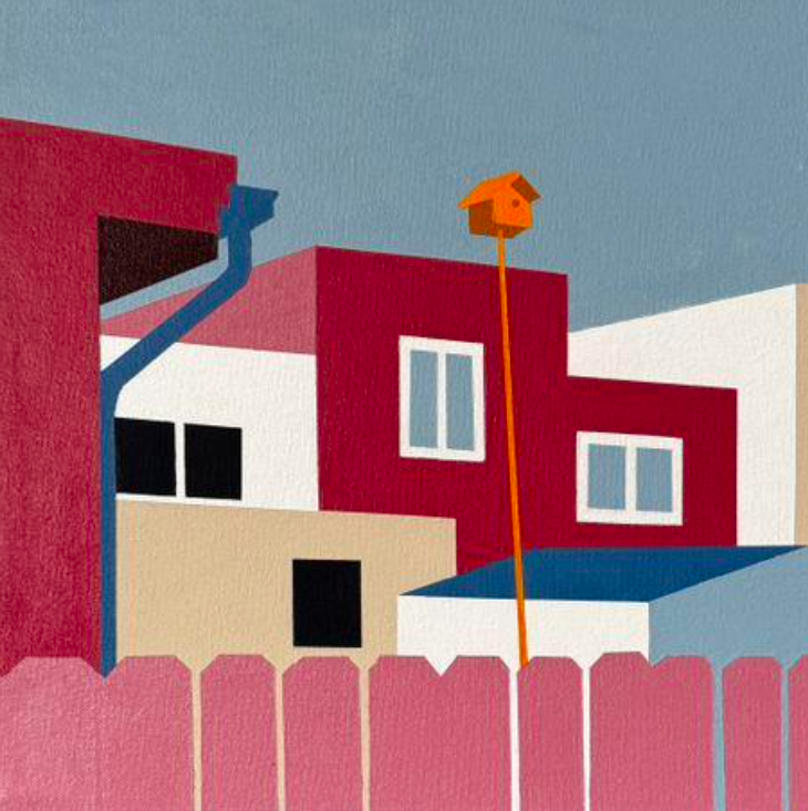 In Neighbor’s Birdhouse, Horowitz turns toward a brighter, almost playful palette, trading the muted tonalities of other works in the series for vivid reds, pale blues, and a striking orange accent. Painted in acrylic on gallery-wrapped canvas, the surface supports her clean-edged geometry while allowing subtle shifts in tone to animate the rigid forms. Here, the conceptual thrust of the Secret Views series deepens: what a neighbor sees, a cheerful birdhouse, well-kept fences, sharply defined walls, implies familiarity and quiet intimacy, while an outsider catches only a fleeting glimpse, forced to imagine the lives behind those windows. Horowitz’s method, sketching, refining angles, and flattening perspective, reinforces this narrative distance; the work offers enough clarity to suggest character but never enough to confirm it, leaving the viewer to navigate the delicate space between knowing and guessing. In this way, she hands the viewer the power to project, shaping each story according to their own experiences, assumptions, and desires.
