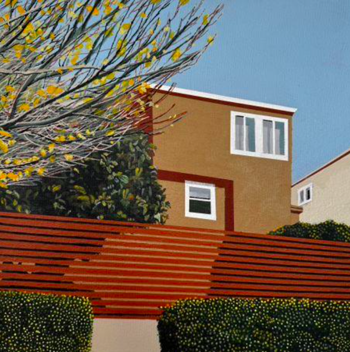 In Secret View from Denslowe Drive, Horowitz’s process reveals itself with decided clarity. Rendered in acrylic on canvas, the work sets the hard geometry of the house and fence against the lively textures of foliage and a tree speckled with gold-tipped leaves. The flat, even planes of the architecture, sharpened by careful angle adjustments in the sketching phase, play against the stippled dots and shifting patterns of nature, emphasizing her signature contrast between brutalist order and organic unpredictability. The canvas adds a subtle resistance beneath the brush, softening the precision just enough to give the work warmth, while the layering of acrylic and ample use of painter’s tape achieves crisp edges and a smooth matte finish. The result is a quietly observational piece, inviting the viewer to pause before a seemingly private moment, caught at a distance yet brimming with intimate detail.