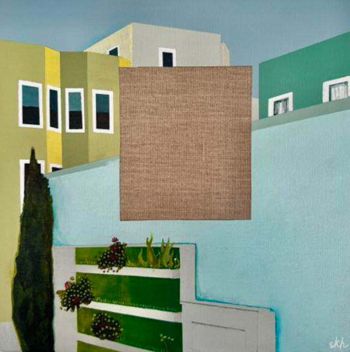 In 85% of a View from McCormick Street, Horowitz combines the architectural precision of her Secret Views series with the conceptual rigor of her Gender Wage Gap works, producing a composition that feels both familiar and fractured. Painted in acrylic on linen, the piece relies on Horowitz’s trademark precision, hard edges taped off and sealed with Tyvek (a synthetic material made by DuPont that consists of non-woven, high-density polyethylene fibers) to achieve clean, sharp lines, yet its focus is the void at its center. She begins by masking this blank square, the absent 15 percent, before building the rest of the image in calm tones of yellow, green, and pale blue. The surrounding architecture feels orderly and contained, but the raw linen interrupts that sense of completion, drawing the eye to what isn’t there. The result is an image that initially reads as serene but holds a disquieting imbalance, compelling the viewer to confront the gap as both a formal disruption and a metaphor for systemic disparity.