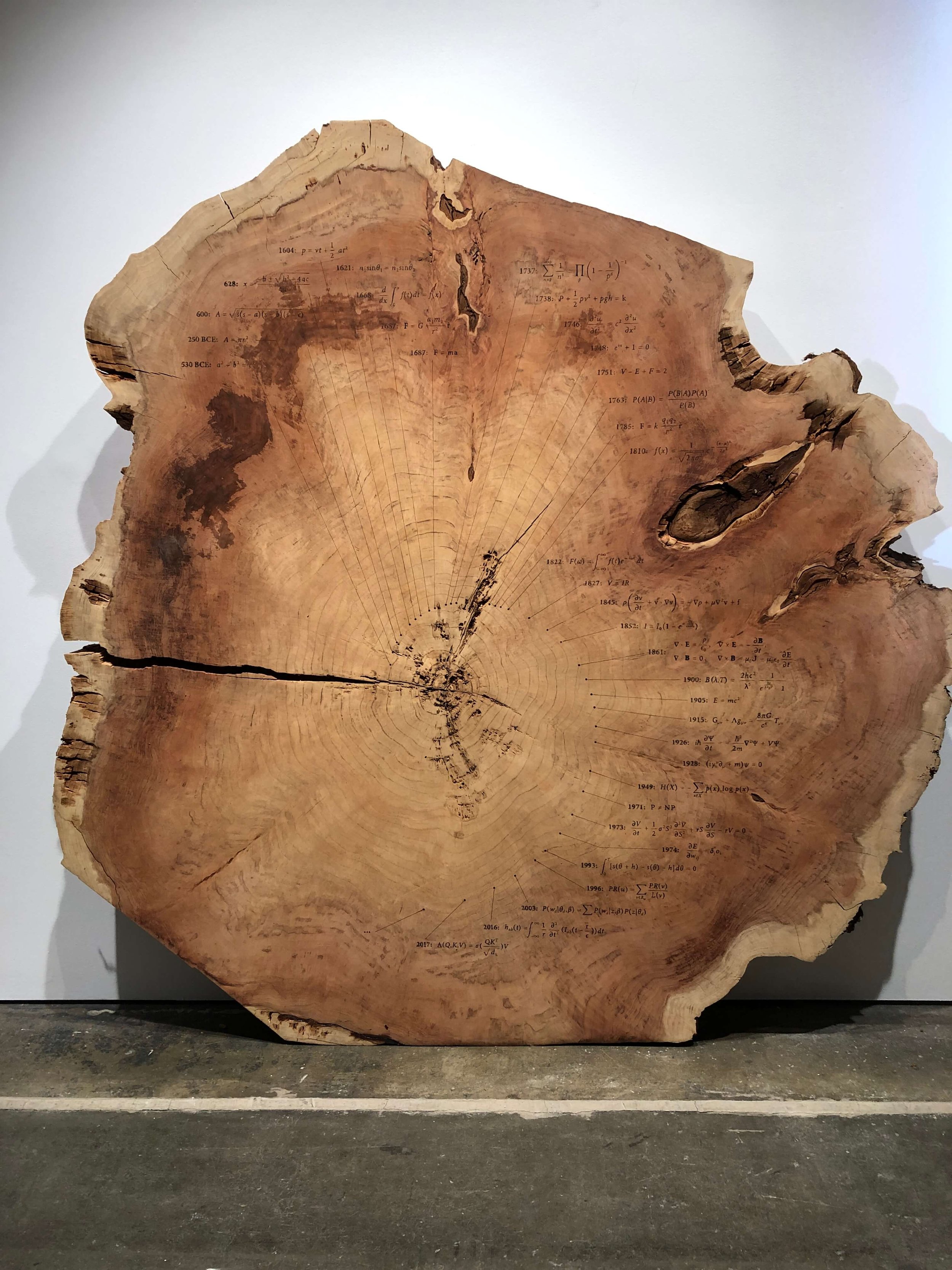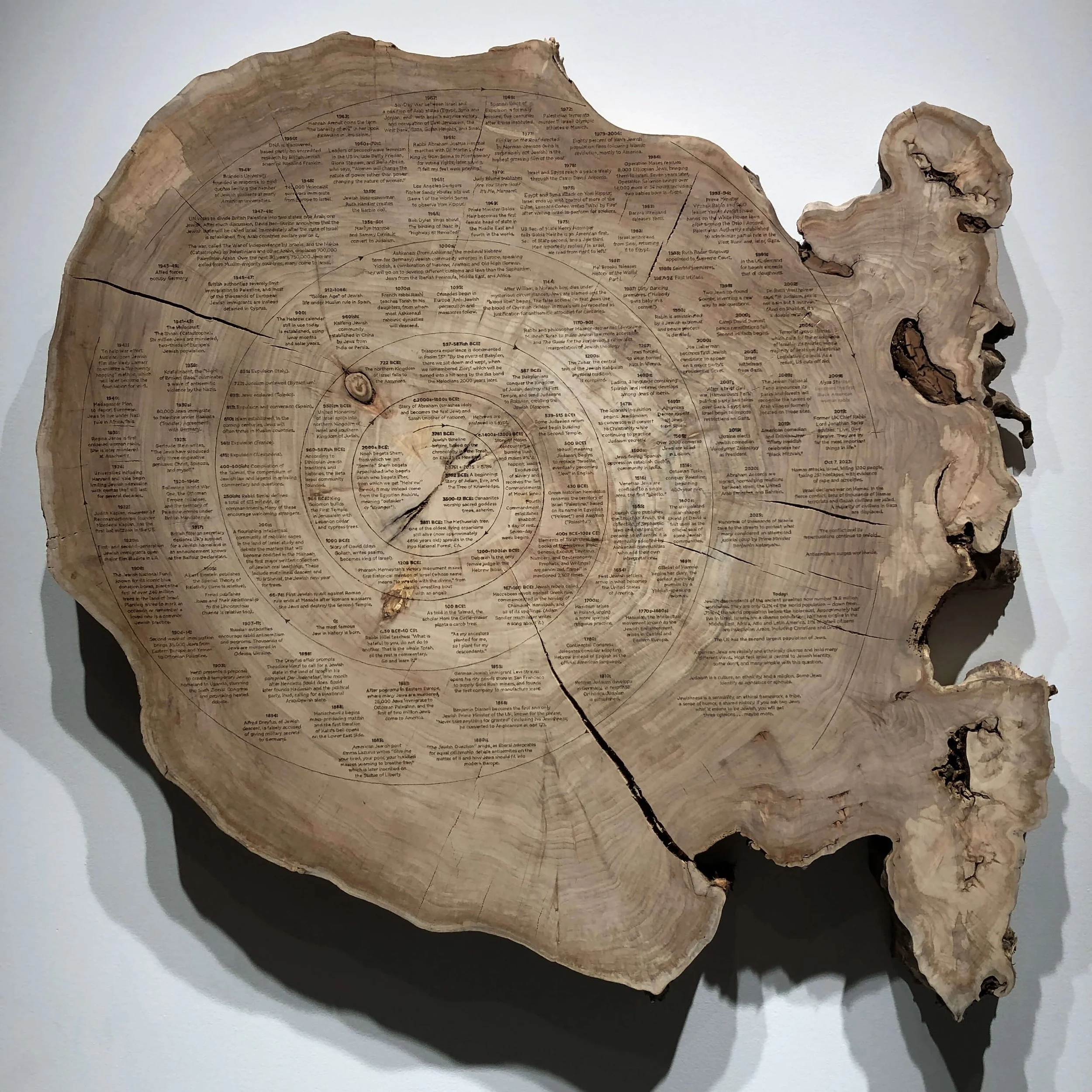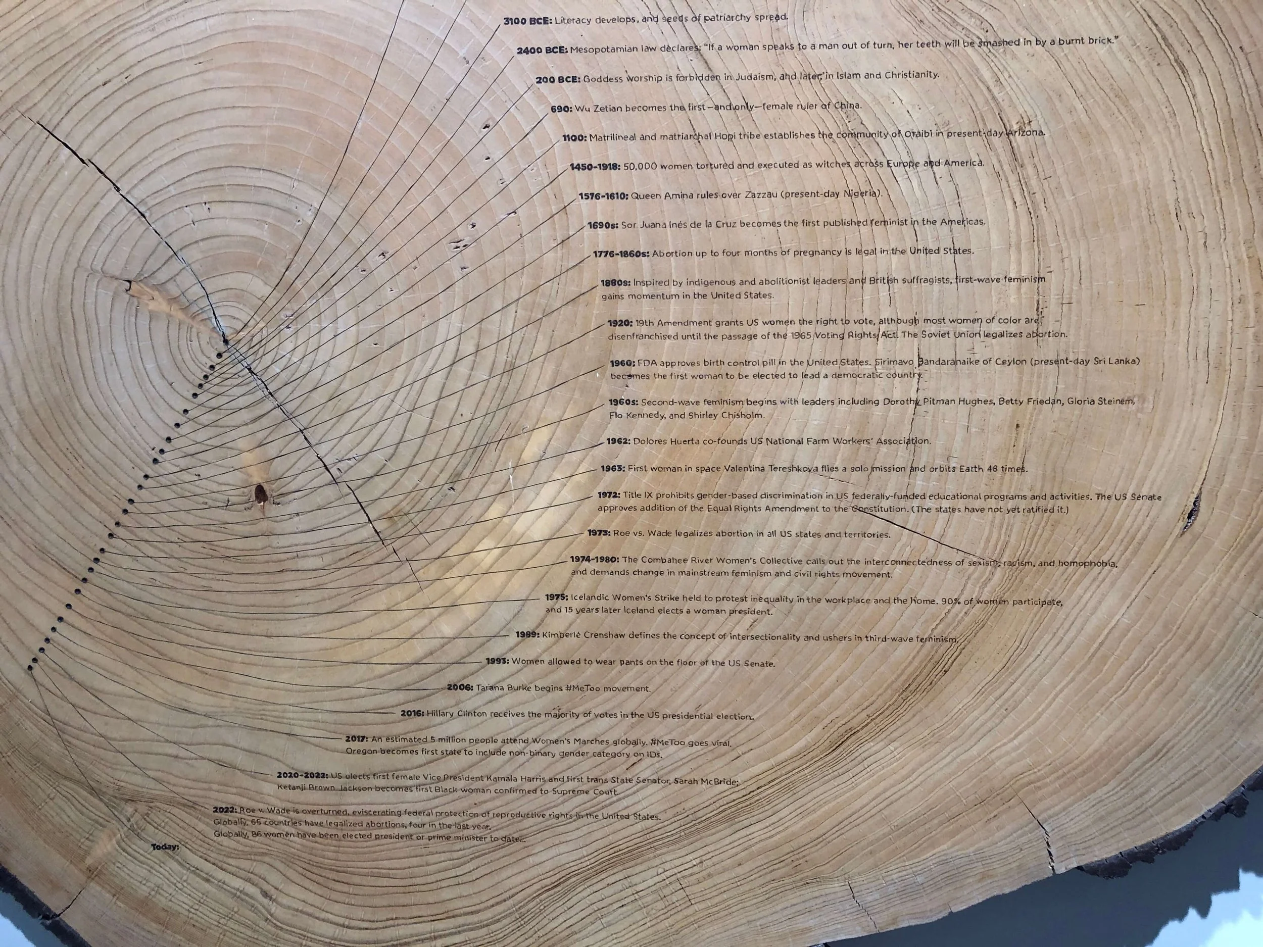 Dendrofemonology: A Feminist History Tree Ring presents 50,000 years of history through a feminist lens with a selection of 33 milestones from “50,000 BCE Goddesses Worshiped” to “2022 Roe v. Wade is overturned” burned across its rings.