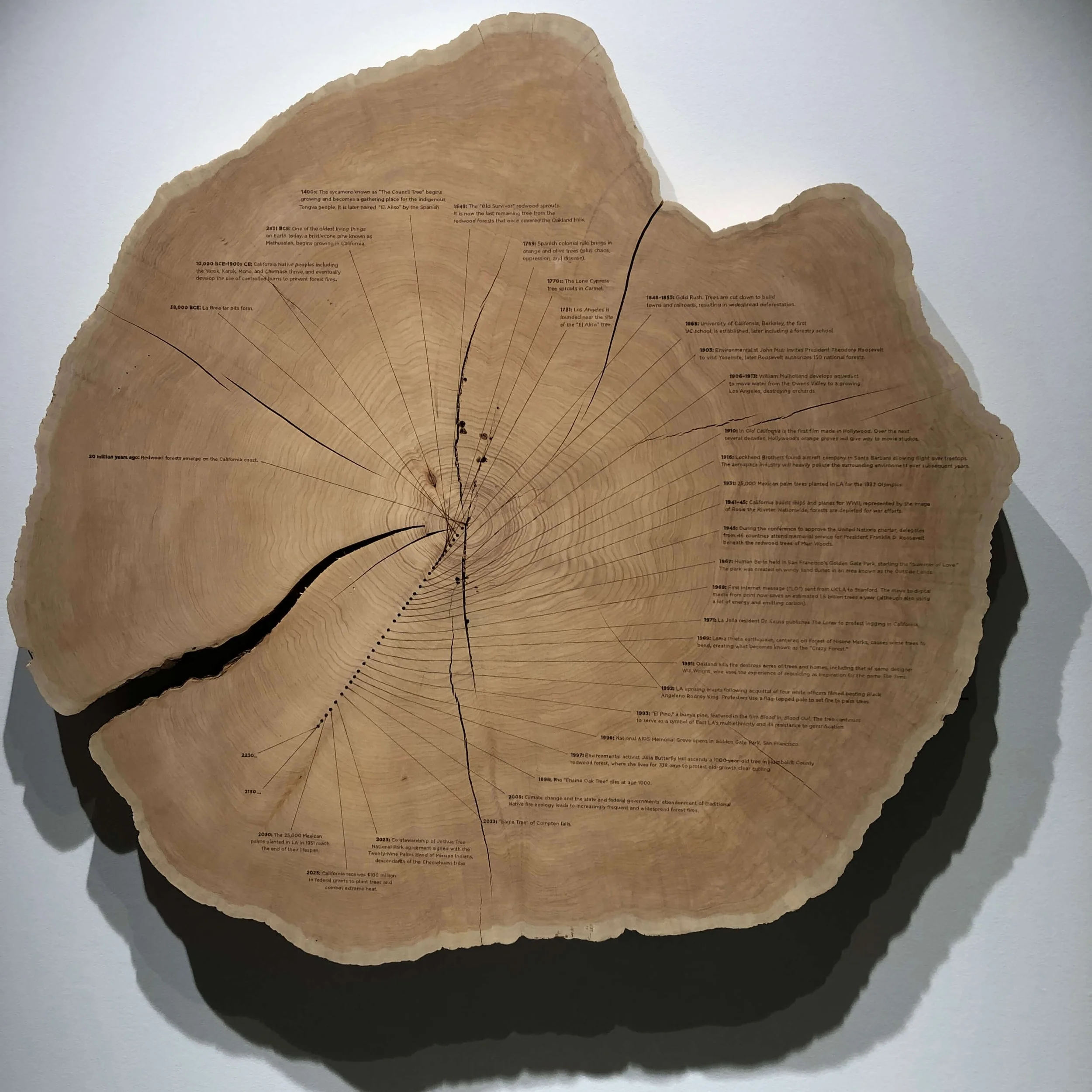 The most integrated of ecology and human impact can be visualized through Living on the Edge in which the artists have mapped out geological and botanical events in California from the beginning of redwood forests (twenty million years ago) and the formation of the La Brea Tar Pits (38,000 BCE) to the Los Angeles planting of 25,000 palm trees imported from Mexico (1931). The consequences of the development and growth of Los Angeles as water diversion, aeronautics, and urban sprawl reconfigure the landscape ring with a hollow echo. It reverberates with a death knell marked for 2030 as thousands of palm trees reach their life expectancy. The ephemeral quality of the modern and the short-sightedness of contemporary planning is placed in perspective – writ on the material evidence of time. How the thousands of years of established forests can be devastated so quickly by overconsumption and social habits becomes a question raised by each ripple of bark, by every ancient deep core.
