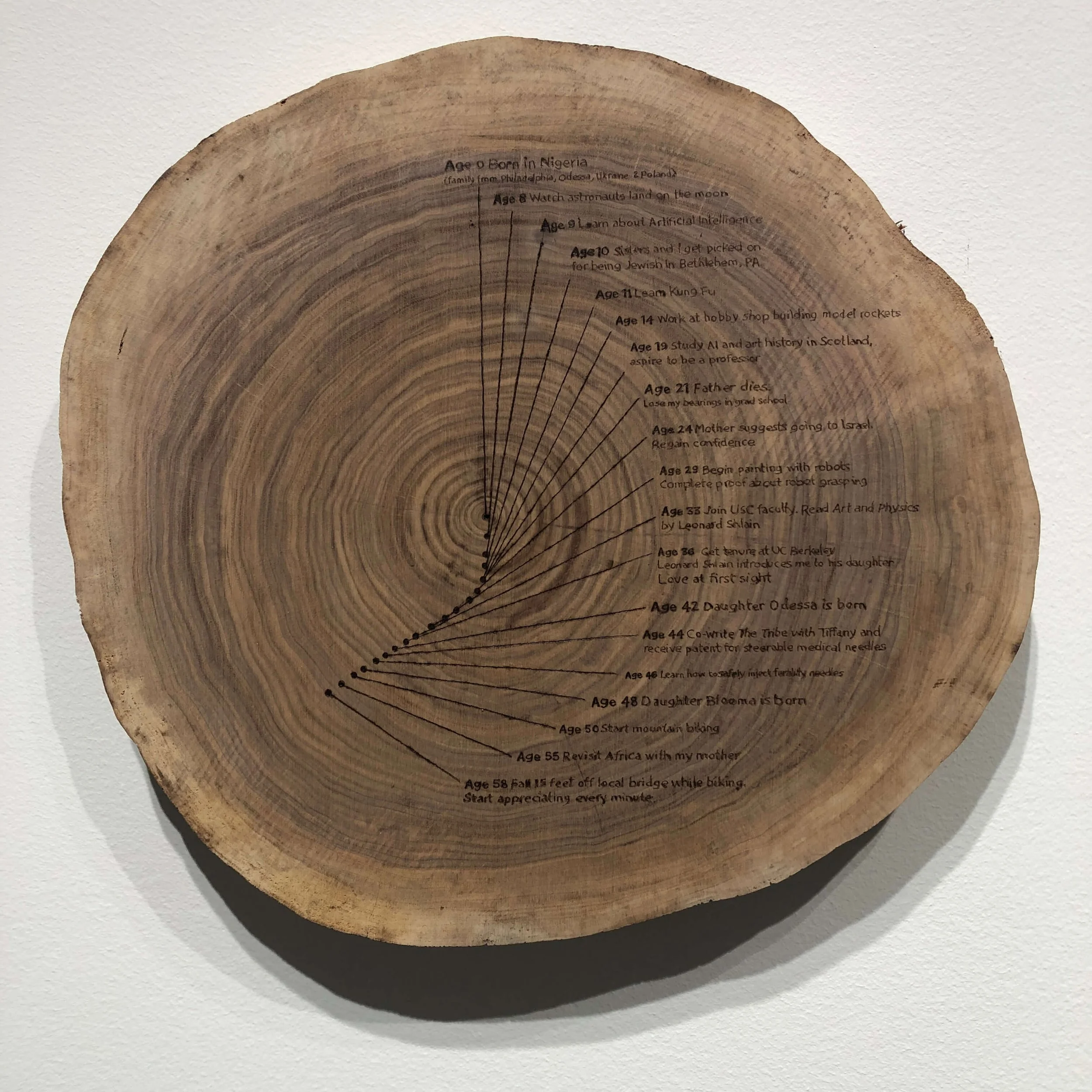 As collaborators, in marriage and in art, Goldberg and Shlain have a give and take, a back and forth as playful to witness as a Spencer Tracy—Katharine Hepburn 1940s film exchange: clever, witty, edgy, yet holding a warm sense of security in research and scholarship. Theirs is a common dedication and compassion. With cross sections of younger trees that have had lives closer to a human span, the artists have each created a self-portrait through incised autobiographical points on their individual timelines. Hanging side by side on the wall it is hard not to expect these pieces to collide, dovetail, merge, like tectonic plates pushing and shifting with subduction or uplift.