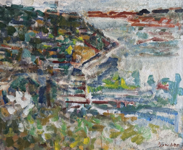Moving into the 1950s, Bowden’s main work took on a new density and deliberation. While continuing to work with the immediacy of pastel and watercolor, adding the layered richness of oil paint, he began producing more detailed compositions that balanced abstraction with recognizable subjects. In these years, landscapes and figures emerged with greater clarity, yet still carried the structural experimentation and spatial ambiguity that had always defined his vision. The result was a body of work that felt both grounded and elusive—paintings that could suggest place or presence without ever surrendering fully to depiction. It was a period of refinement, where Bowden’s command of form, color, and texture reached a quiet maturity.