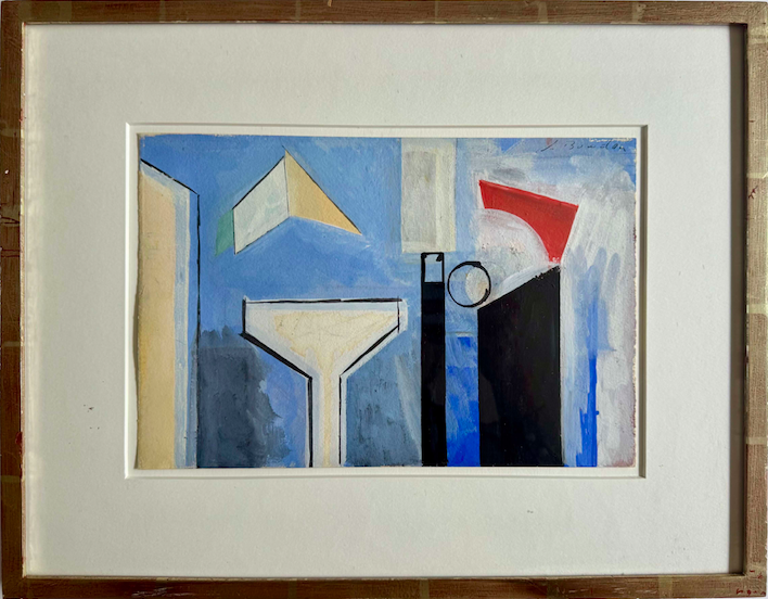 Take Untitled, 1938, for example—a gouache that shows Bowden at his most subtle and searching. His hand feels both assured and exploratory, with soft washes of translucent blue forming a backdrop that immediately evokes sky, or at least the sensation of open air. That airy ground shifts the viewer’s perception: what might otherwise read as pure abstraction begins to suggest space, even atmosphere. Against this gentle expanse, Bowden overlays a loose scaffold of ochres and rust-toned lines—angular yet tentative, like the memory of a structure rather than the thing itself. This creates a nostalgic melancholy as though the viewer is looking at a photo of old friends. The painting holds its form loosely, inviting you to consider not just what you see, but what might be vanishing or forming within it. There’s no urgency to resolve it. Instead, Bowden lets the gouache breathe, as if he's more interested in evocation than in answers.