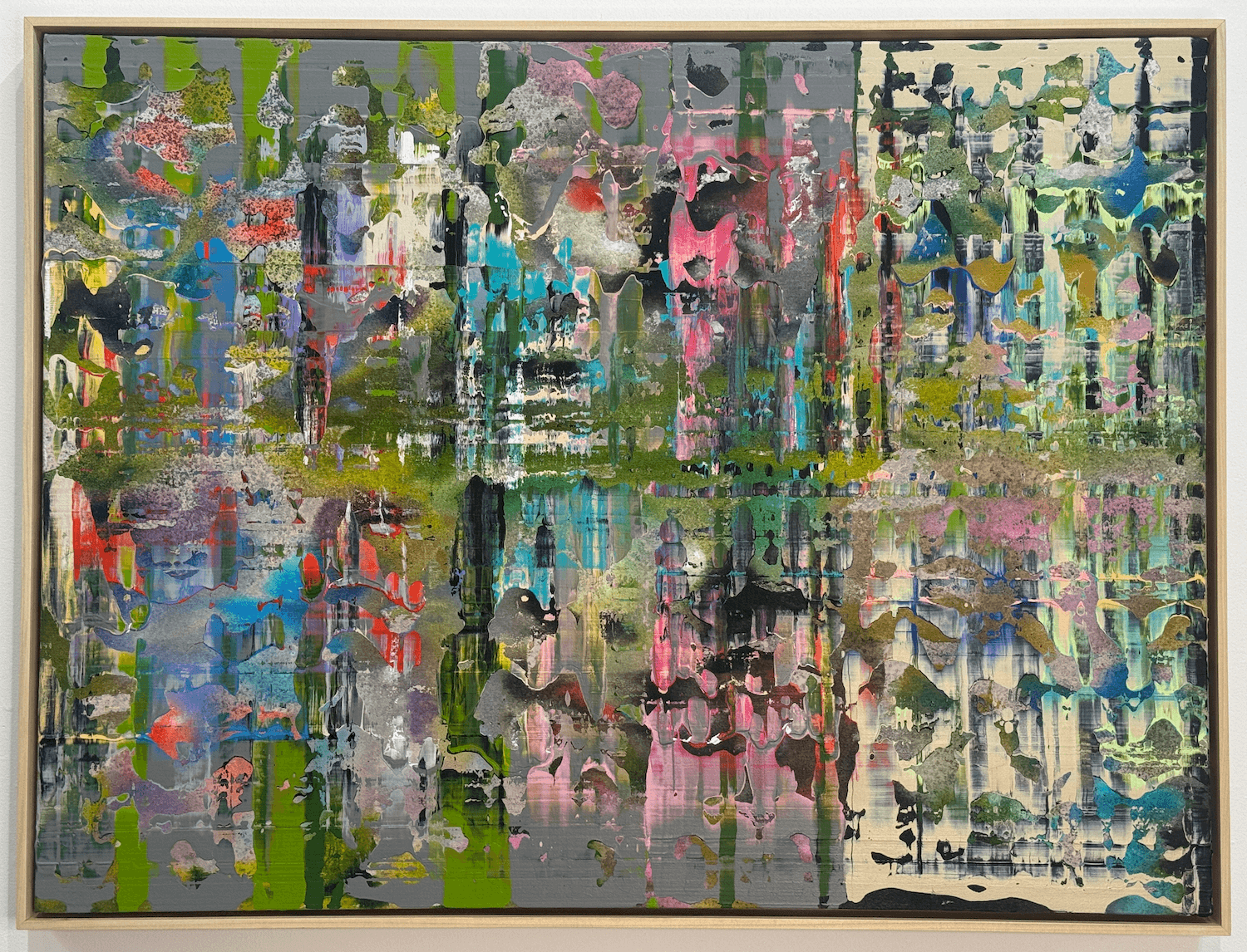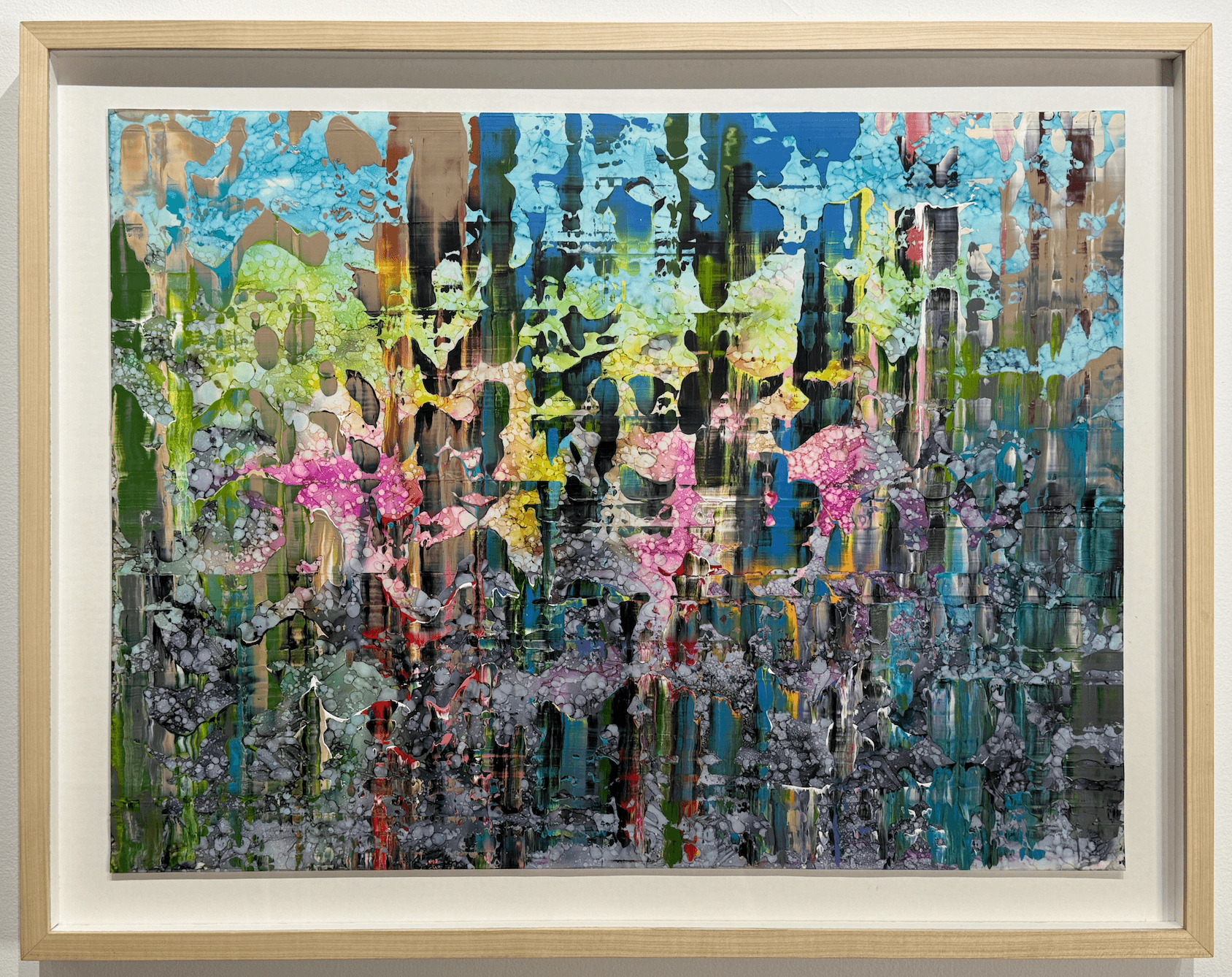 Nobody Speak (2026) by Henze is a horizontal painting in ink and acrylic on Yupo. The scintillating array of colors meets the eye as a series of bubble forms underneath layers of multicolored pigments. While blue/black/green are the dominant themes, bursts of pink and yellow and undercurrents of violet lie beneath the painted surface. The dense layering impulse, so different from her graphic murals on buildings, encourages a rich play for the eye that wanders restlessly around the surface finding countless moments of color harmony and contrast that capture a dynamism of life on this surface. The vertical lines that are the remnants of scraping multicolored acrylic paint across the surface are broken up by the underpainting made with ink and finished with a hair dryer to generate an automatic series of forms beneath. On her site, this image follows directly a photo of Bruno’s bar in the Mission, as it has been transformed by various graffiti writers and also by vines, a form of natural reclamation.