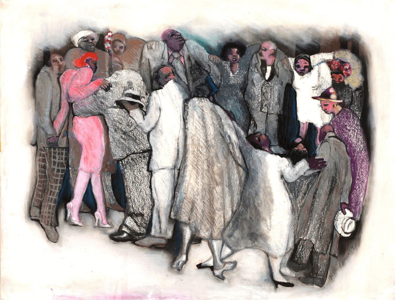 Robinson mentions the colorful clothing of fellow public transit riders as sources, and her dance background is apparent in several pieces, notably (Untitled) Diner (1986) and Benediction (1987)—figures swaying and jumping, alive and exuberant, resembling Ernie Barnes’ The Sugar Shack, 1976. An oft-cited influence is also Harlem Renaissance painter Archibald Motley, also noted for figures in motion. Joan Brown’s criteria for evaluating students’ work often boiled down to “energy,” the more of it the better. No wonder she sponsored Robinson! And the energy didn’t diminish—Porch was completed in 2023, her last year of life.
