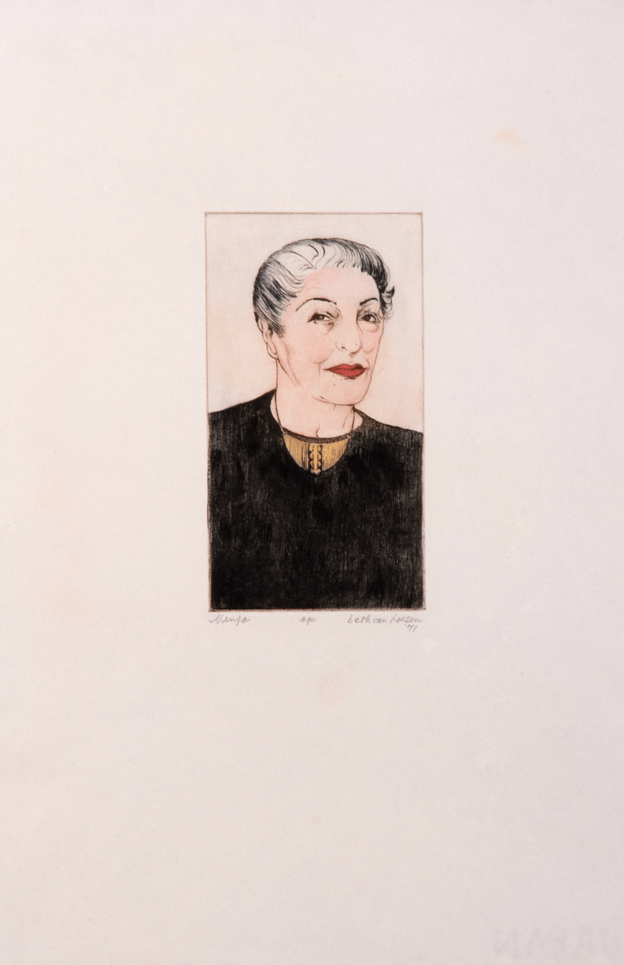 Beth Van Hoesen (1926-2010), Ninfa,1971, Drypoint with roulette: Printer's ink on paper, hand colored with watercolor, Press/Printer: Artist, 6 ⅞ x 3 7/16 inches, Gift of the E. Mark Adams and Beth Van Hoesen Adams Trust, Saint Mary’s College Museum of Art Permanent Collection, 2025.2.52