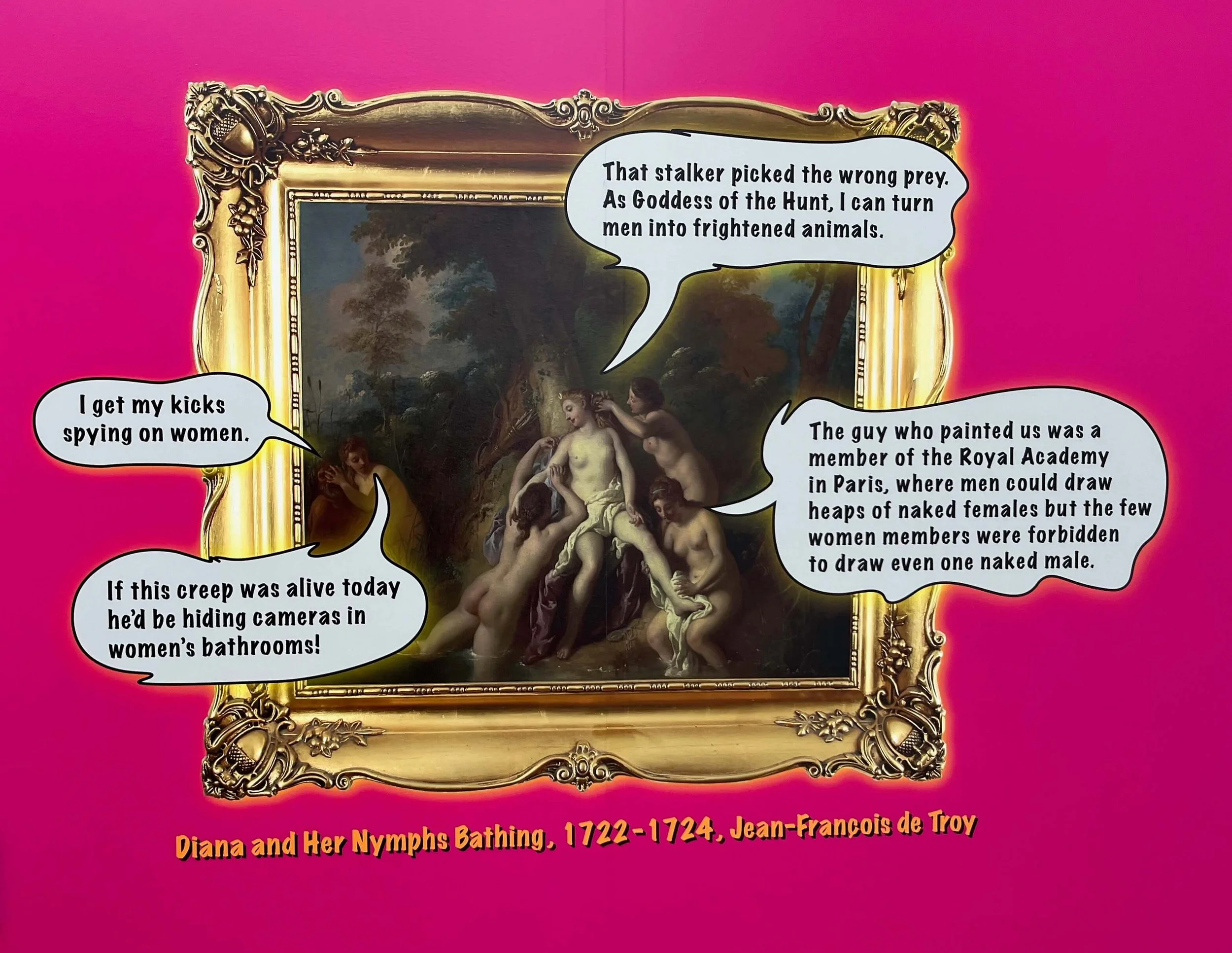 One of the subjects in Jean-François de Troy’s painting of multiple nudes, for example, is made to speak: “The guy who painted us was a member of the Royal Academy in Paris, where men could draw heaps of naked females, but the few women members were forbidden to draw even one naked male.”