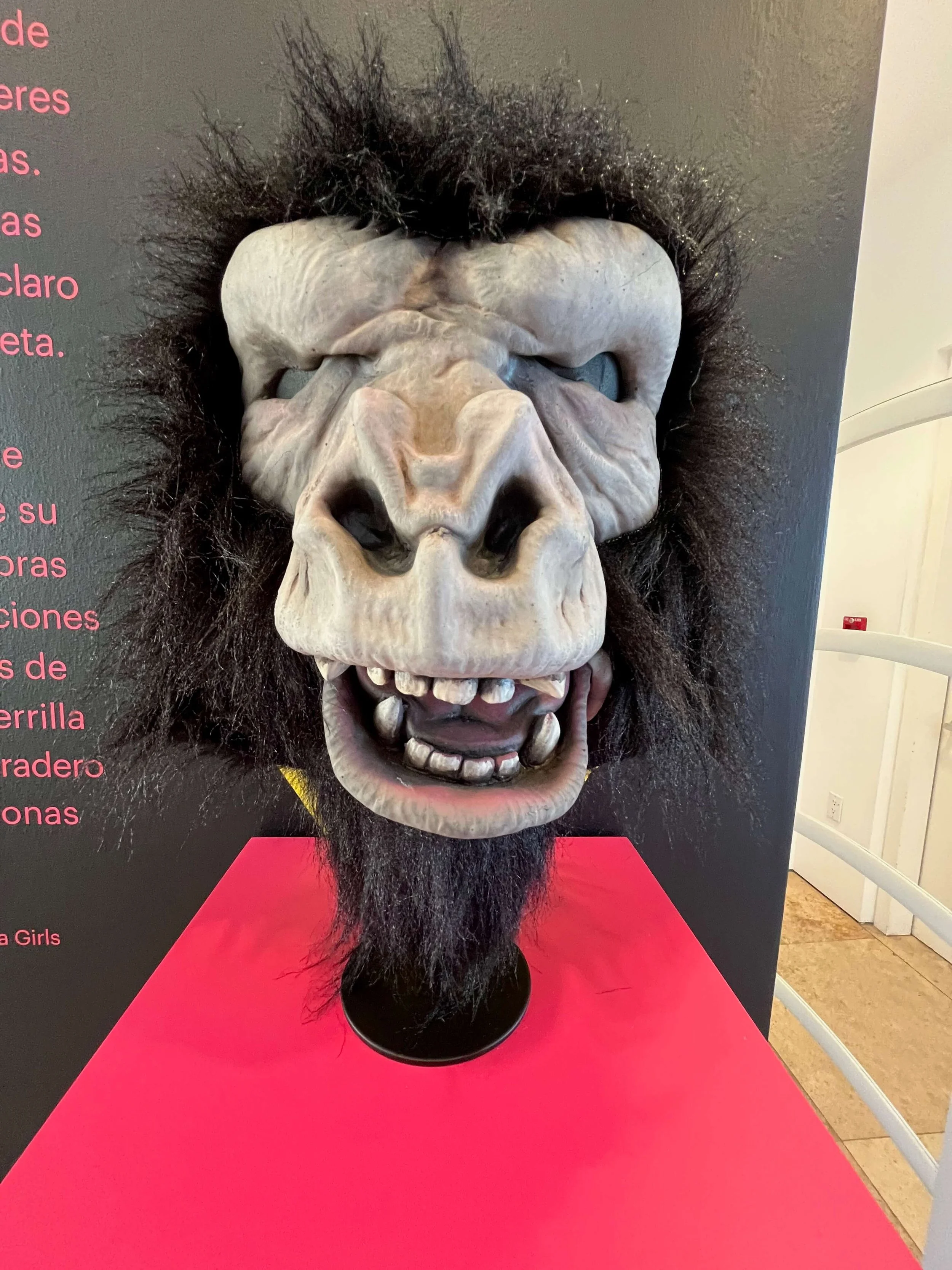 The exhibit does, however, include the item most identified with the group: a mask. Though the collective identified with political guerrillas, one member who went to get masks to preserve anonymity apparently mistook the homonyms, guerrilla and gorilla, and wound up with ape masks.