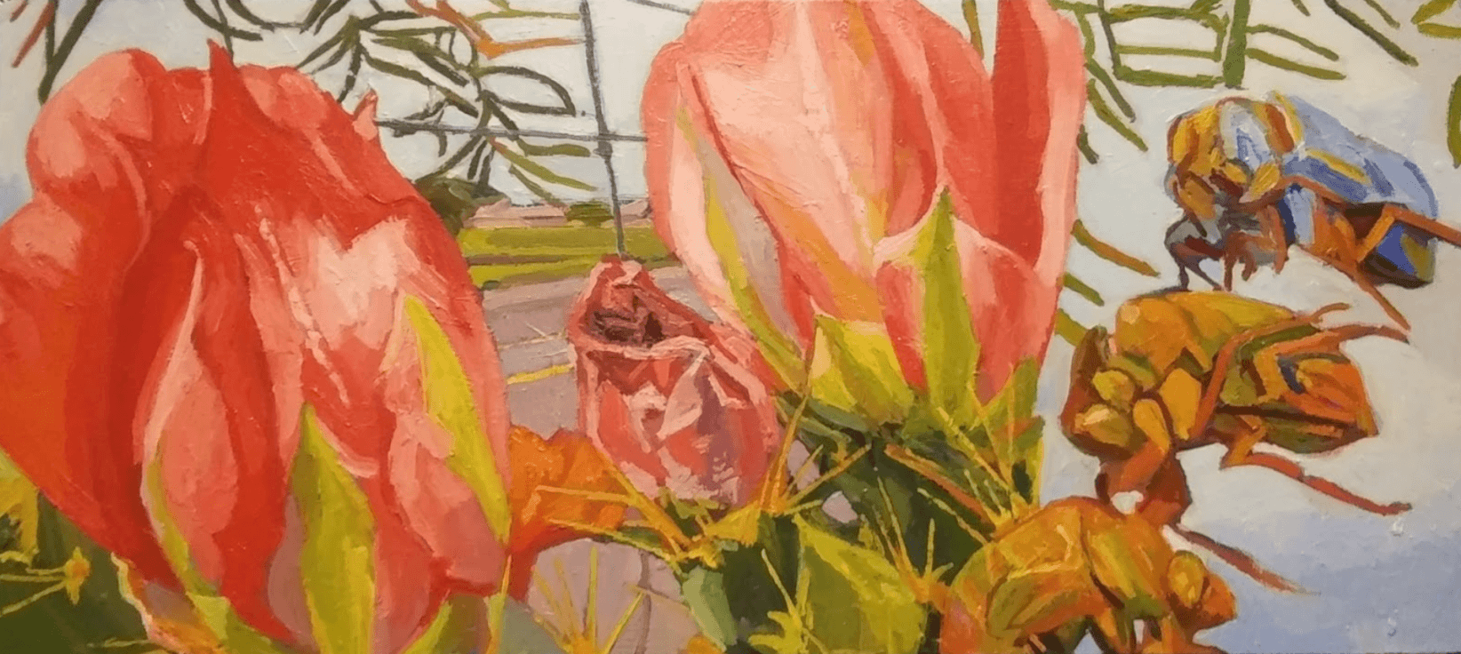 Jerry Lyles’ exhibit “Outside” consists of eighteen oil paintings whose subject matter is the Rio Grande Valley in south Texas. In the paintings, the viewer encounters mesquite trees, cactus, tangled branches and wildflowers. There are no humans in Lyles’ paintings. In two of the paintings (The Shoulder Ends and East Side Refrain) there are images of cicada skins, an insect known for its buzzing and vibrating sounds in the summer. In another painting (Studio View, At The Truck Rest), the top of Lyles’ car is discernible near a tree and surrounded by flowers, while another (Untitled) depicts the arts complex at University of Texas, Rio Grande Valley (where Lyles teaches) at dusk. Taken together, the paintings in this exhibit depict the chaotic and vibrant flora of the Rio Grande Valley, where the glow of life is present. Lyles thus provides a different image of the Rio Grande Valley: not military checkpoints, shopping malls, outlets, or new highways permanently under construction, but life.