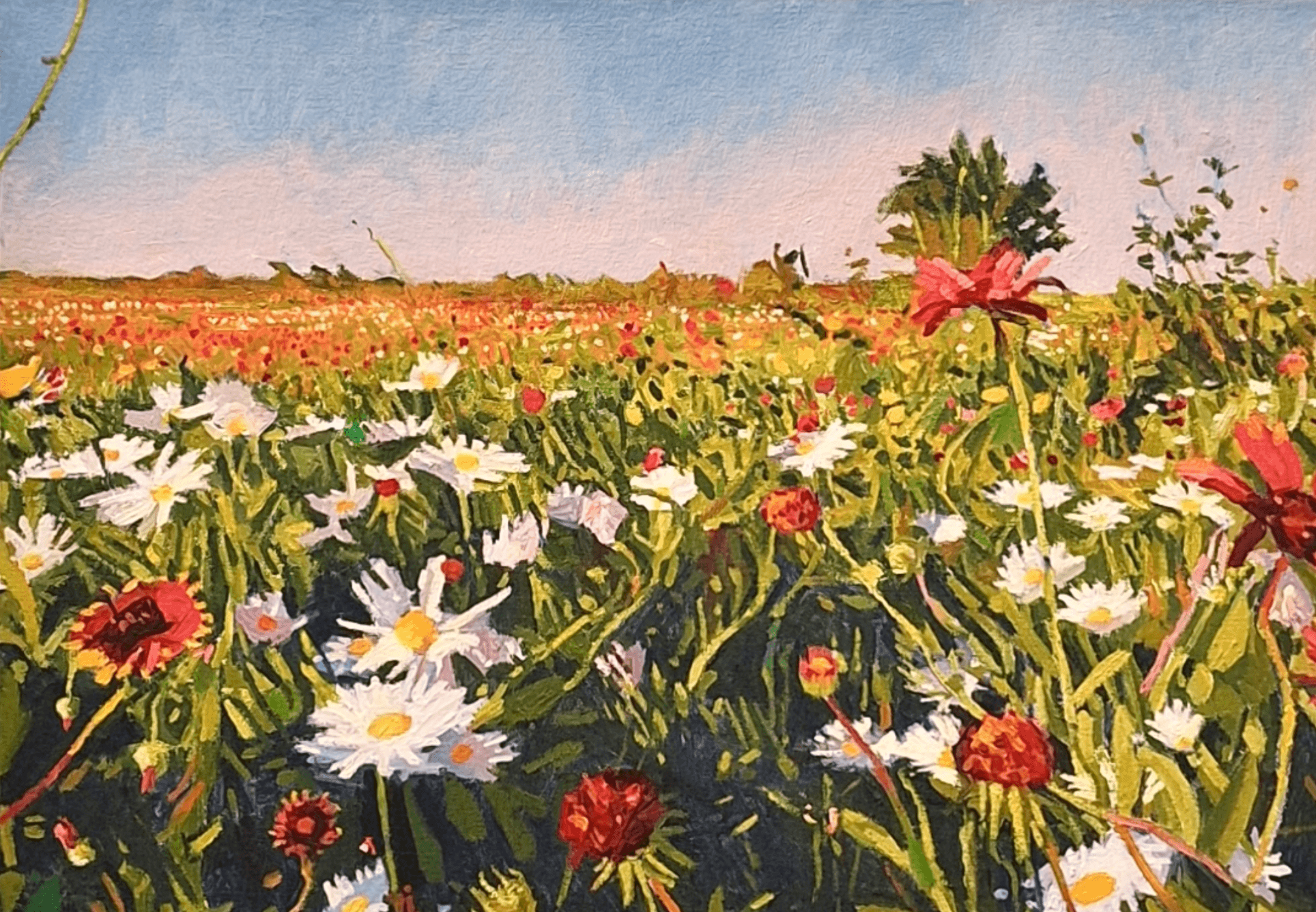 In the largest painting on display, Studio View, At The Truck Rest, Lyles’ white car is slightly detectable. In the same painting, a mesquite tree tilts to the left in the upper left corner, a red flower tilts to the right, and the sky opens in the middle. The landscape bends, like everything in the Rio Grande Valley. In Untitled 2024, the perspective proffered by the painting situates the viewer in a field of flowers. Another landscape painting (Rest Stop on 281) is more abstract and blurred, recalling Paul Cezanne’s pointillist landscapes. Another landscape painting gives the viewer the illusion of coherence. In two others (Moon Rising and Soft Landing), mesquite trees are half dead (a mixture of green and brown color in the trees), but somehow still alive and thriving.