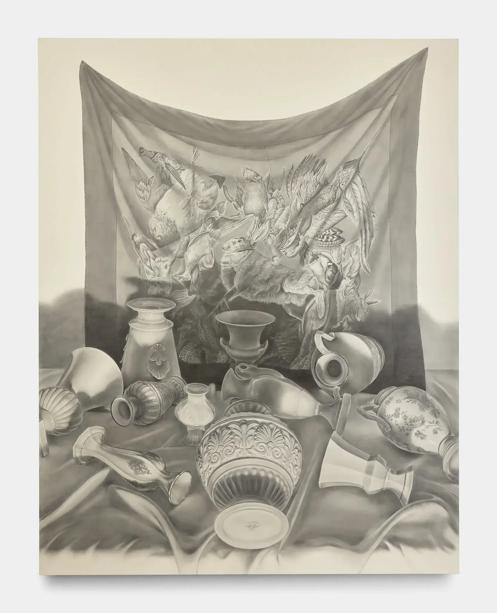 When Vetne set up the props to draw Death in the Pot (2025), massively scaled at 70 x 55 inches, she tacked to the wall a vintage Hermes silk scarf (titled Game) patterned with enough dead birds and rabbits to make a Dutch merchant blush. “I wanted to treat this luxury object as casually as any animal carcass,” says Vetne (a vegetarian). “I’m interested in how the prey and predator relationship acts as a metaphor about all kinds of power imbalances in our society.” The foreground is strewn with overturned Lenox vases arrayed like ancient artifacts around a central urn from the company’s “Athenian” collection—harkening to a halcyon time when secular and rational thought flourished.