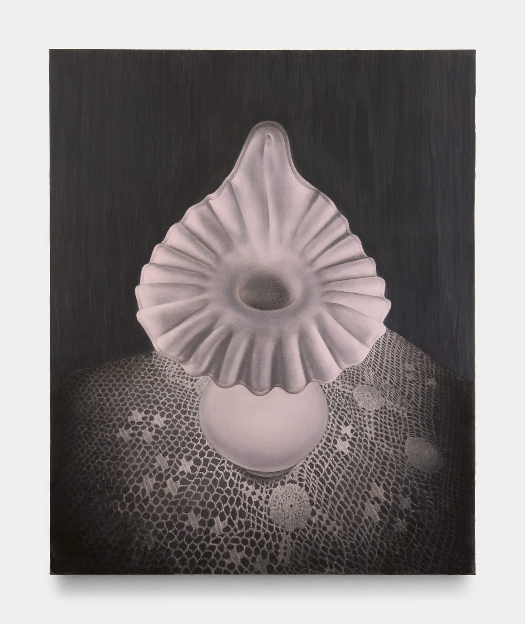 Sharing a name with the show, the work Between Worlds (2025) plays off the Vanitas genre with a stately Lenox vase filled with parrot tulips past their prime, the splayed petals a garden-variety reminder of mortality. The impressive centerpiece has been fractured by being reflected three times in two mirrors, challenging the viewer to decide what is real and what is fake—an increasingly familiar exercise in a world of fungible truth, A.I., and pseudoscience. Tulips, of course, also harken back to the tulip mania of the Dutch Golden Age, when a single bulb could fetch as much as a house, before the market crashed in 1637 and demolished fortunes overnight—a speculative bust-and-boom cycle built on smoke and mirrors not unlike, say, sub-prime mortgages. When it comes to consumer goods, from Louboutins to Labubus, what do we treasure because of its intrinsic value, and what do we crave because of societal expectations?