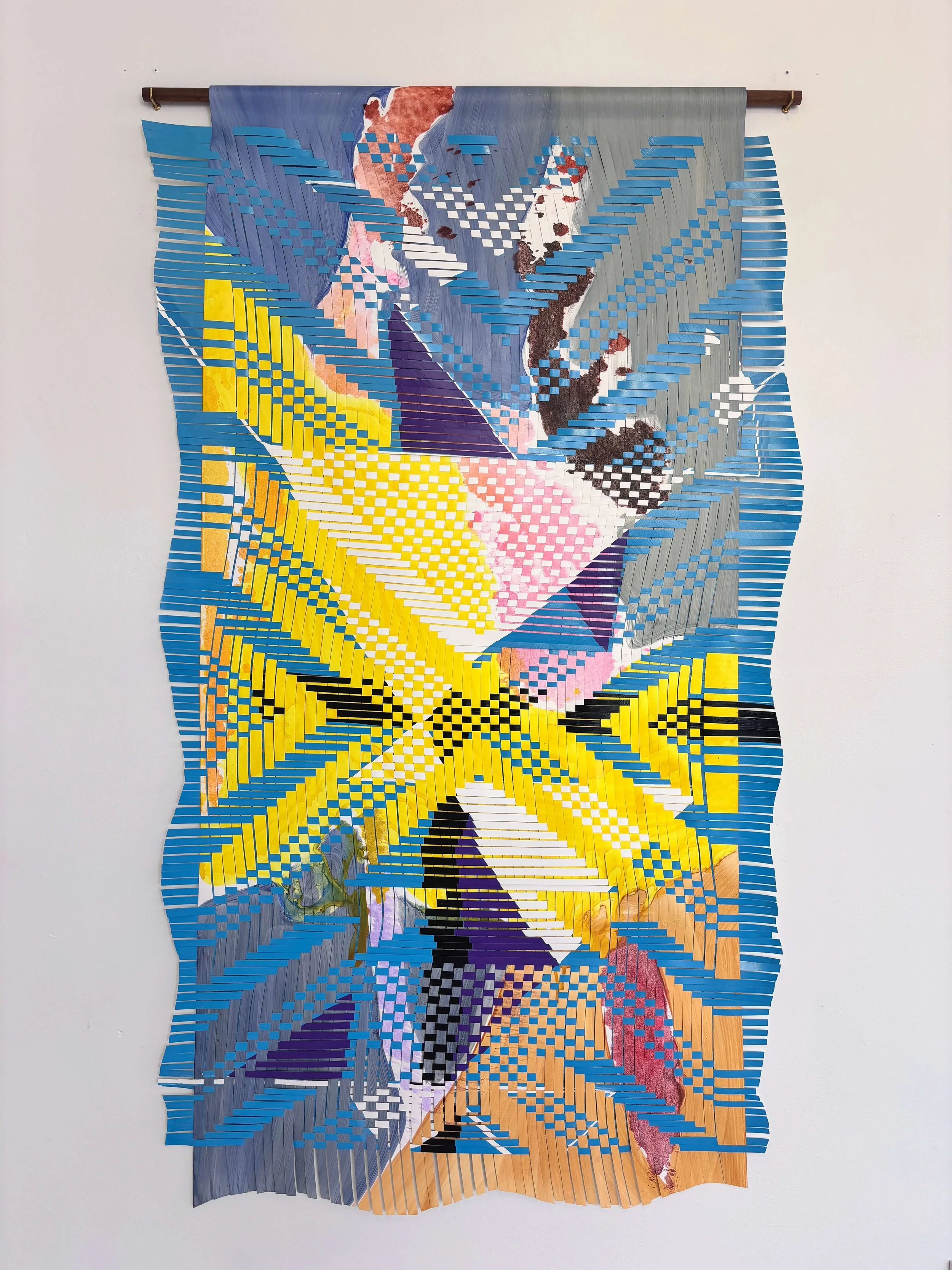 Miguel Arzabe's original weavings incorporate a glitch aesthetic and hues that are cohesive with Reyes' and Martinez's pieces. Arzabe's works are woven paintings, created using acrylic on canvas and paper strips, that portray altered patterns connected to the cultures of indigenous Latine America. One particular piece, Qaka Unku, is presented as a suspended tapestry, allowing for the raw portions of the weaving to create a dynamic edge, a common factor found in his practice. The title translates from Quechua, the most widely spoken indigenous language in South America, to English as "tunic with a rock pattern." With close inspection, you can see rock-like striations and contours that run the length of the weaving.