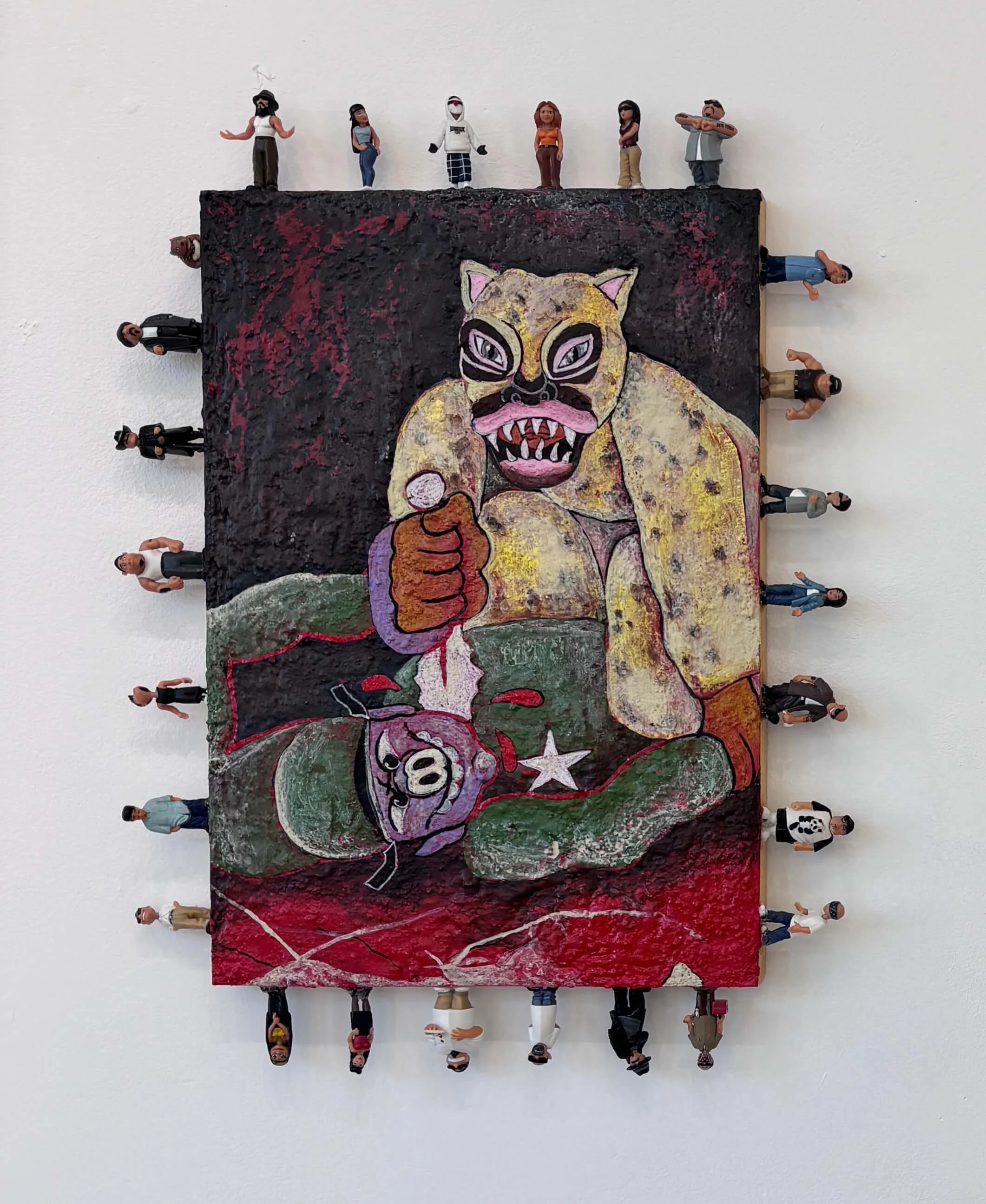 Héctor Muñoz-Guzmán's works employ a sense of play with cultural semiotics and a touch of surrealism. For one, Muñoz-Guzmán's Revolution For The Homies main subject is a jungle cat figure actively beheading a pig-like law enforcer. Muñoz-Guzmán paints on a rough-surfaced cement, advancing the idea that the setting of this action would take place on the streets. The piece is framed by Homies mini figure toys, reminiscent of a millennial childhood, made to represent characters found in Mexican American culture.