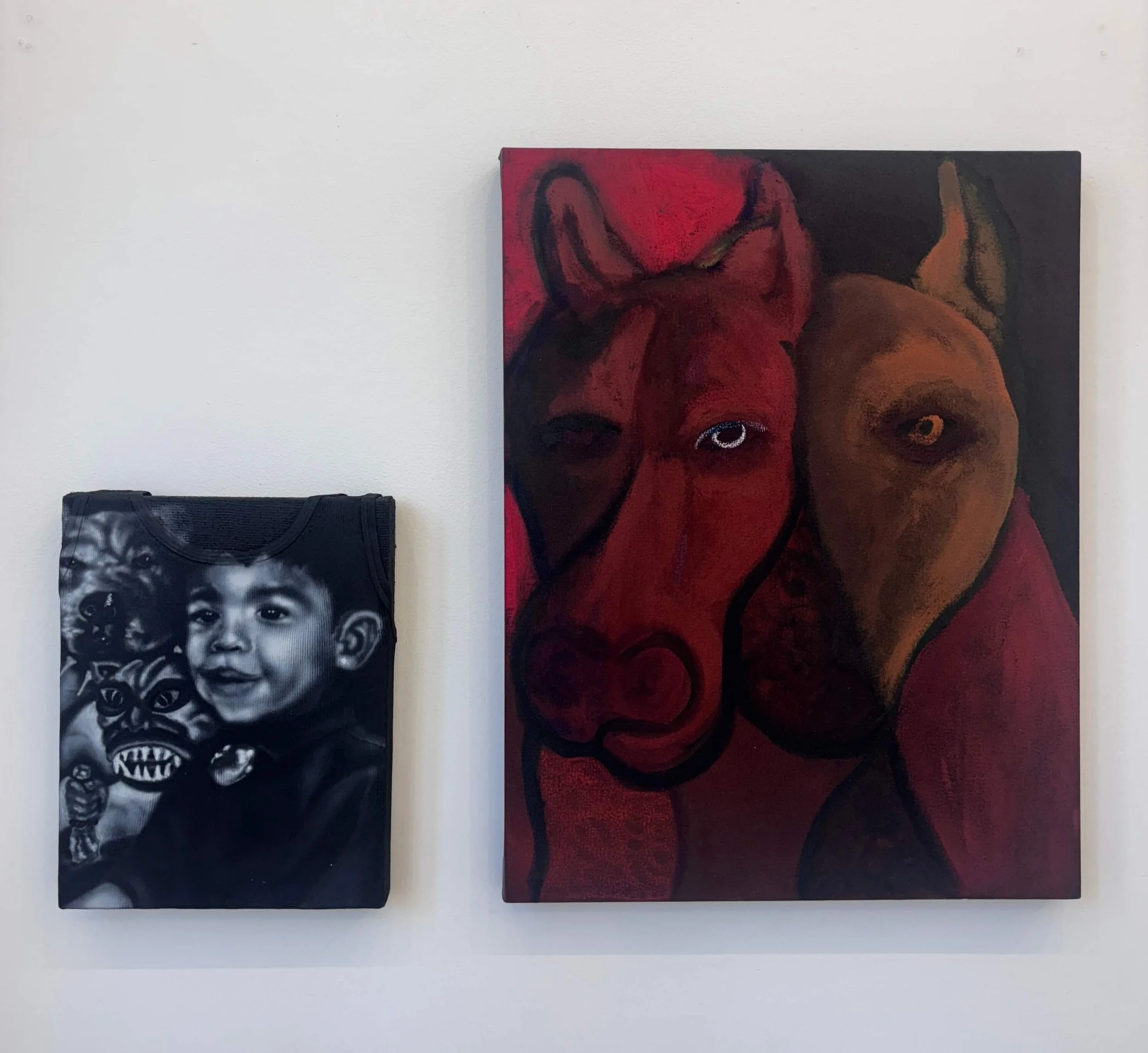 The main wall featuring both Muñoz-Guzmán's and Esteban Raheem Abdul Raheem Samayoa's work is a harmonious pairing. Samayoa also paints on unconventional surfaces like burlap and a baby rib tank top. Interestingly, his practice diverges in two different directions: moody airbrush and food-centric comfort. Great depth is found in the artist's darker works, especially the standouts: 30 Years and Dos Perros.