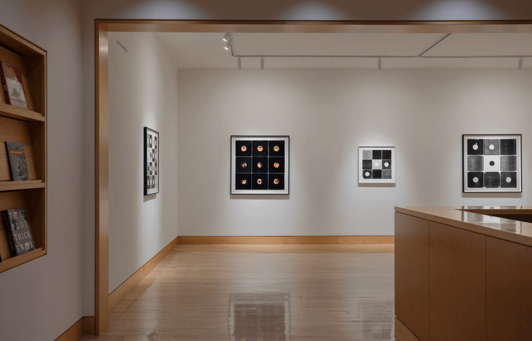 The greeting occurs instantly, stepping off of the 49 Geary Street elevator, the metal doors sliding shut behind you, you're welcomed in by Oculi (Looking), nine record covers and sleeves, each acting as a monocle of the artist's, and the work they hold within. The edges are layered and worn, large circular impressions indicating the record they home. The result is somewhat unsettling. The eyes don’t just look, they return your gaze, not in stasis, but actively searching, identifying, and observing the observer.