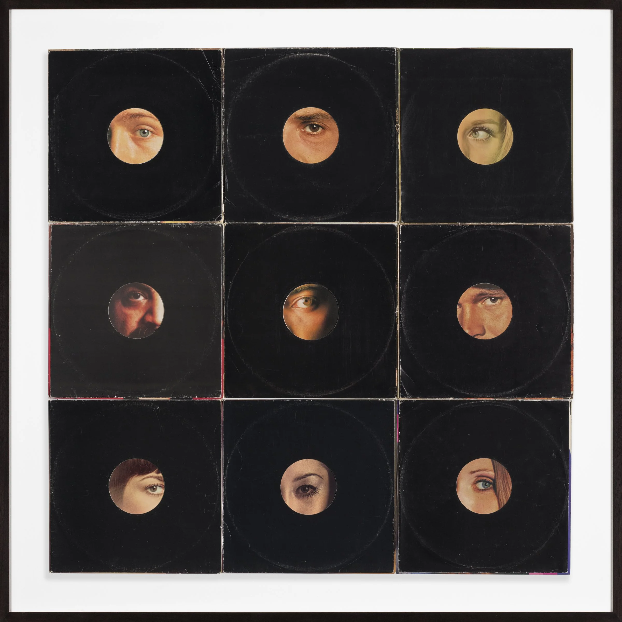That feeling of intention is physically experienced. The eyes in Oculi don't establish tone, but establish relation. The record sleeves, previously containers for sound, are transformed into apertures, absence becomes a frame, and the circular cutouts, which used to hold vinyl, now hold gaze, the welcoming gaze. The hole where the record once sat feels less like something missing and more like something opened.