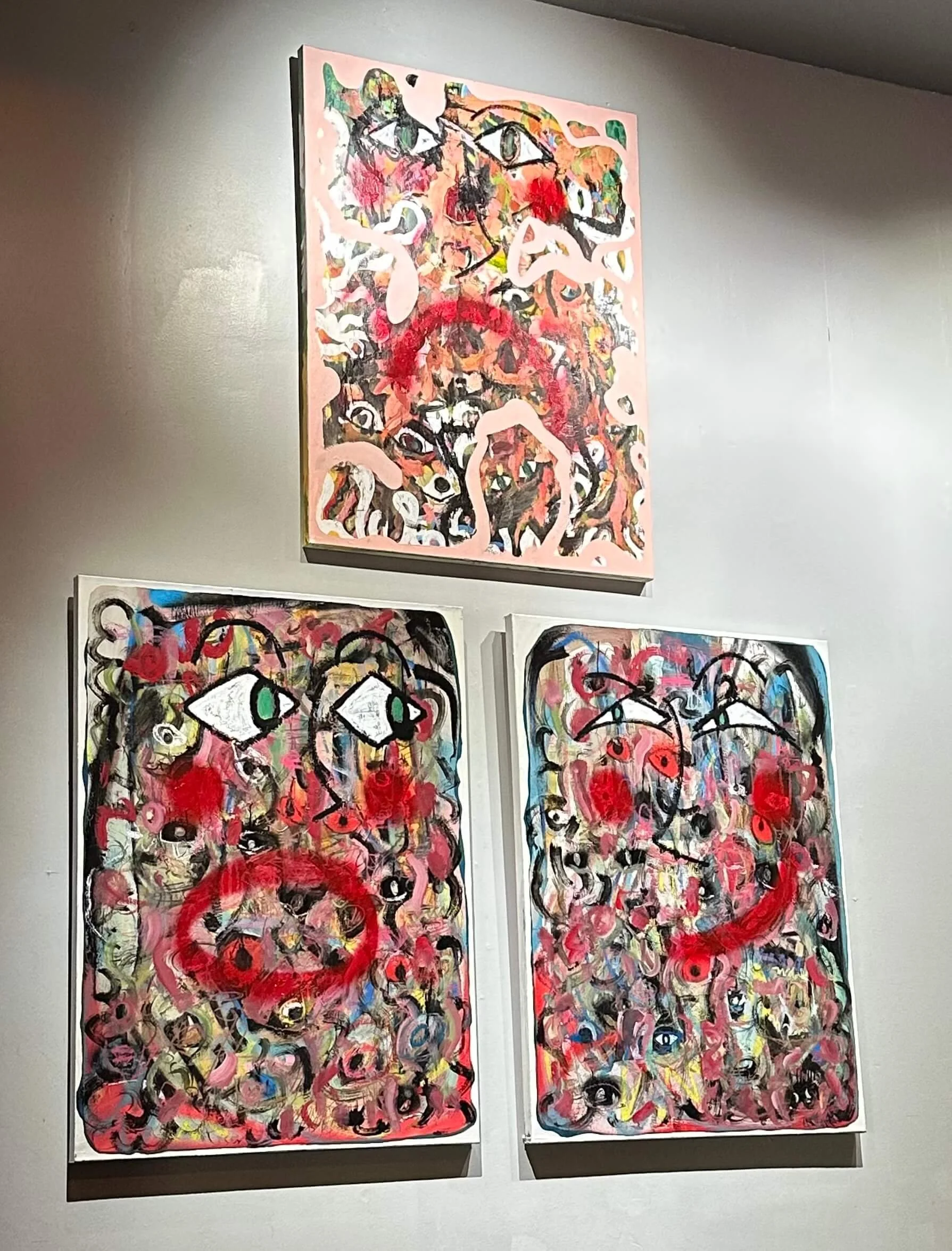 The three works on the adjacent wall do not immediately relate to the first cluster; their layering and stylistic treatment feel distinctly different. Yet as a bridge between the earlier scenes of mask-making and the back area’s multiplicity of masks, these broadly abstracted faces— pushed to the edges of their rectangular supports— read as masks themselves, operating on a different register within the artist’s universe. Beneath each singular face, a sea of smaller faces, recognizable by Goku’s distinct eyes, fills the ground with a restless, diffuse agitation . They may also resonate with what psychiatrist Robert Jay Lifton described as the ‘Protean Self’: the range of identities we hold and synthesize into a flexible, singular sense of self. In a broader moment shaped by defensive certainty, the ability to entertain multiple selves can seem less like strength than risk. Outwardly, spaces for ambiguity appear scarce, doubt is treated as weakness, and openness rarely galvanizes on command. Such pressures can isolate the deeply human desire to weigh carefully—even the voices within us.