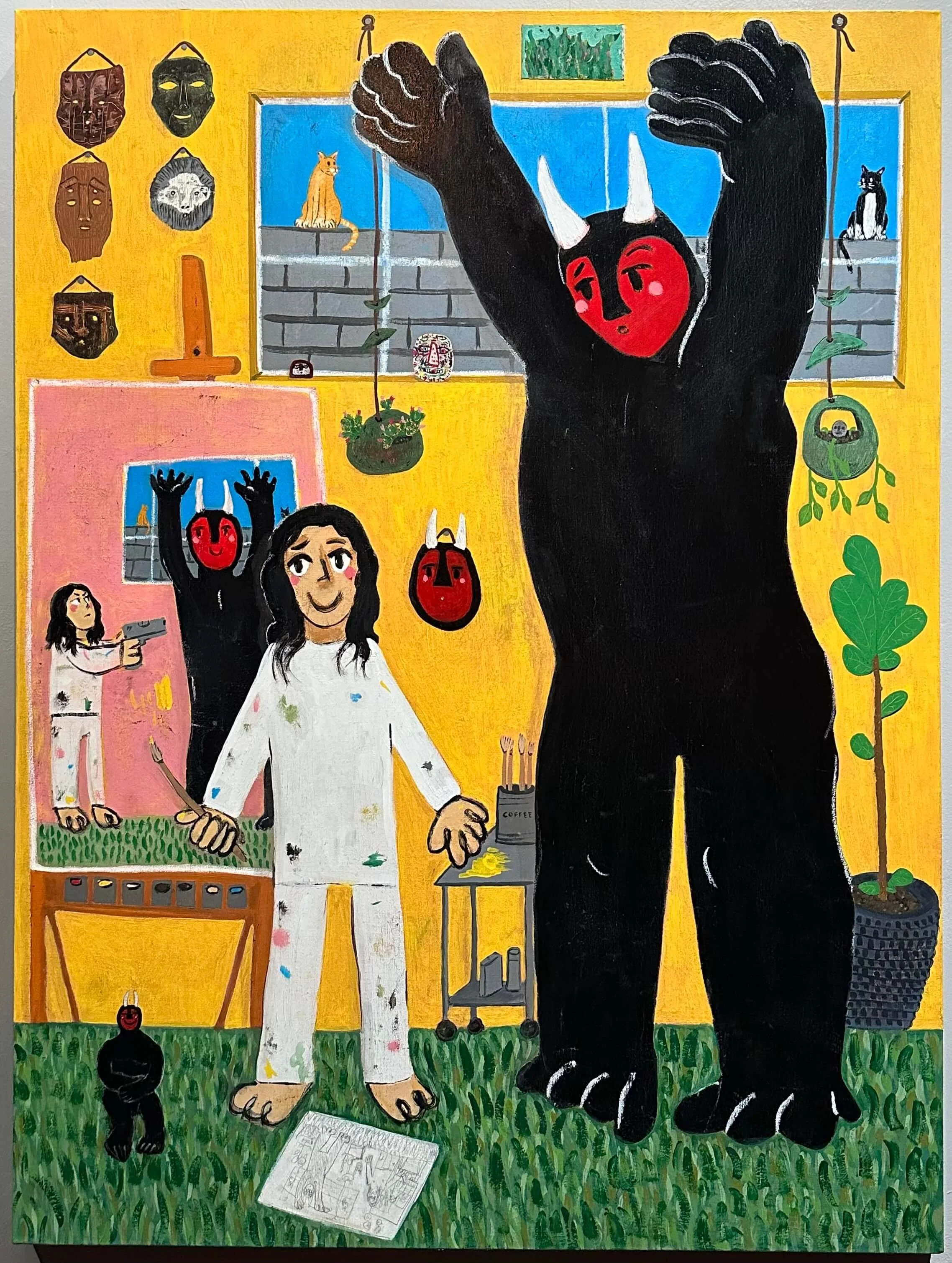 The title of the show is overtly psychological, and upon entering, the viewer is plunged into the artist’s personal mythology. On the first wall to the left is a series of five paintings and two masks depicting a small, child-like figure (an inner child) alongside a devilish mask, set against saturated green, blue, and yellow backgrounds. The mask is primarily worn by a monstrous, muscularly bulbous figure, though in one elevated painting, it appears on the childlike figure, as suggested by white sleeves.