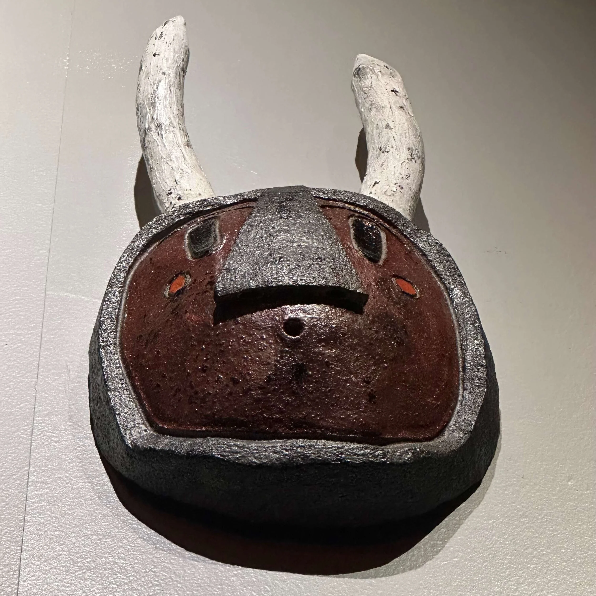 (L) Goku Mcafee, King’s Burial Mask, Glaze & Glass on Terracotta, Gas Fired, Dimensions N/A 2026 (R) Goku Mcafee, Pearl God Mask, Glaze on White Clay, Gas Fired, Dimensions N/A 2026