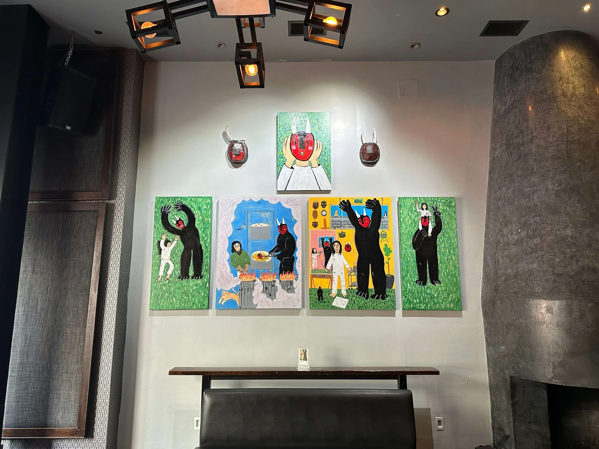 The show opened March 13, and there are multiple avenues for interpreting the work- each deserving its own written exposition. To be clear, this review is written as a cold read—a formal analysis of the pieces in the space, without deeply researching the narrative or internal logic of each piece. Here, individual works are used to unpack others, because the exhibition depends on a deeper structure—one that resists immediate coherence and unfolds through cumulative, multilayered reading. It is worth noting that while many bars and restaurants exhibit art, it is underappreciated how well SWIG serves artists: two large walls flank its fireplace, accommodating mural-scale pieces, while a back area with a lower ceiling offers a more intimate viewing experience— and throughout, the lighting is superb. The space actively strengthens the reading of the work.