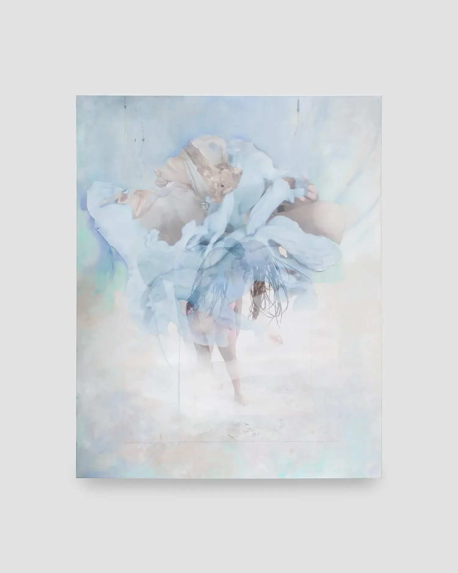 The photocollage with paint and embroidery, Spirit of Ge, depicts several female bodies swaying and interweaving within an ephemeral blue field. Suspended in a womb-like central space, they appear both emerging and dissolving, not yet fully formed but charged with possibility. The work evokes life at the threshold of becoming, where identity has not yet solidified.