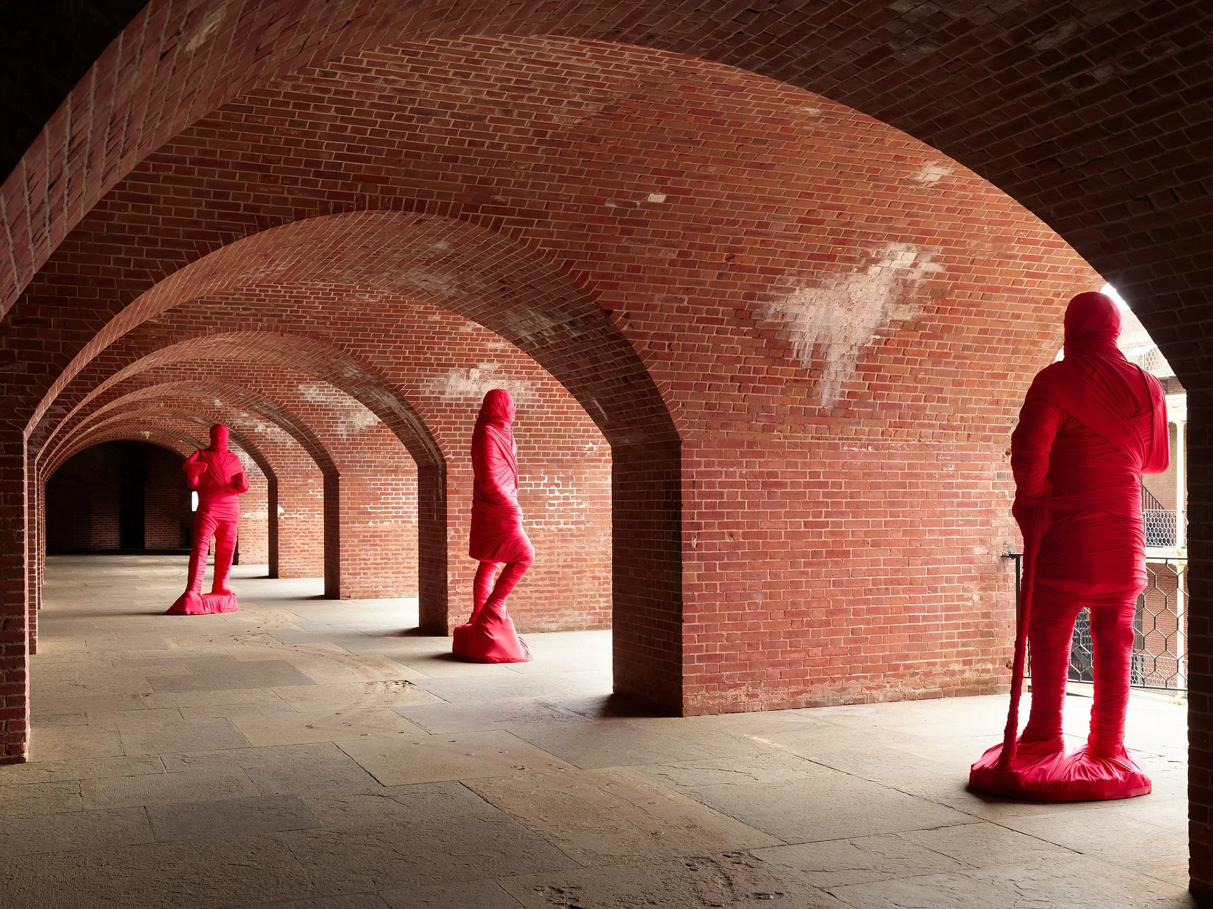 MH: It's all the same thing. It's still making, it's still figuring out problems and how to make things work. While I was working on one of my last big series, I did a series based on film stills. The film I shot when I was 14, maybe turning 15. I found them and I worked on those at Magnolia. Prior to that, probably maybe five or ten years, I had taken a roll of wallpaper, old wallpaper that I found at an antique shop and I said, I want to use this sometime. Later that was happening. While I was doing that series, I began thinking about a piece that I just completed at Fort Point where I shrouded three figures in red fabric. I think you probably saw that one—three figures were at Fort Point and one was at Capp Street. At Capp Street I wrapped Junípero Serra, who was another snake. Religion can do a job on you if you let it and don't use your head. I wrapped all of them in Make America Great Again fabric color—not fabric but color—the red, because my idea behind that is that I'm going to tell a different story and a different story will make America great, and at least it'll make people aware of a different story from a different group of people, but we're all in this same place. So I wrapped Junípero Serra, the guy who made the Star-Spangled Banner, Francis Scott Key, and then the first elected governor and the first elected senator. I wrapped them all in the red. Those three were at Fort Point and they're about 9 and a half feet tall. It just came down because of the government shutdown. It was supposed to be up through this month, but it had to come down at the beginning of the month.