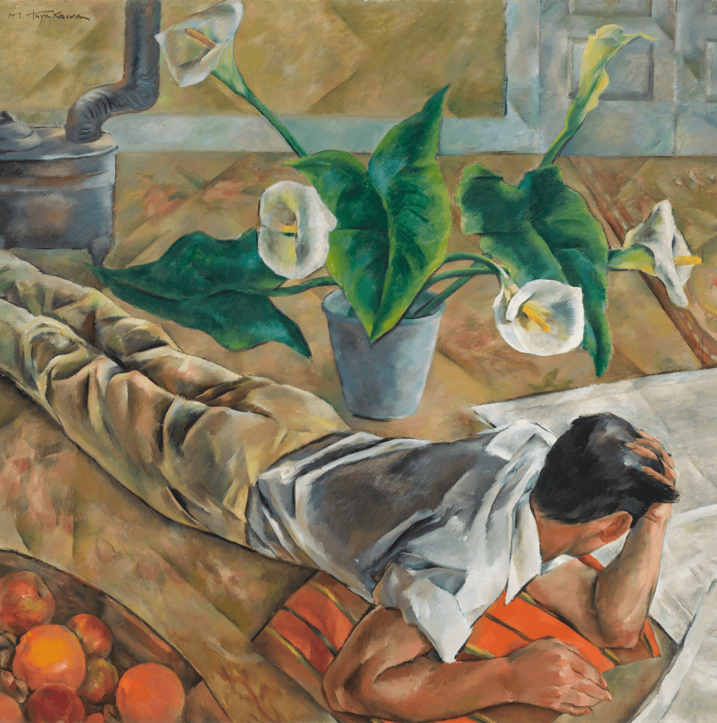 Hayakawa settled into the Santa Fe arts community, her palette brightening with the Southwestern climate and landscape. She continued with portraiture. Three of her earlier portraits of a young man remembered only as Edward are clustered together at one entrance to the exhibit, including the large (40” square) painting One Afternoon, circa 1935, now in the New Mexico Museum of Art. A male figure lounges casually on the floor, surrounded by mounds of fruit, cala flowers with prominent pistils (Georgia O’Keefe wasn’t the only one to notice their erotic symbolism), and curved stove pipe which underscore the sensual atmosphere. In the other two, Edward wields a saw and plays the ukulele.