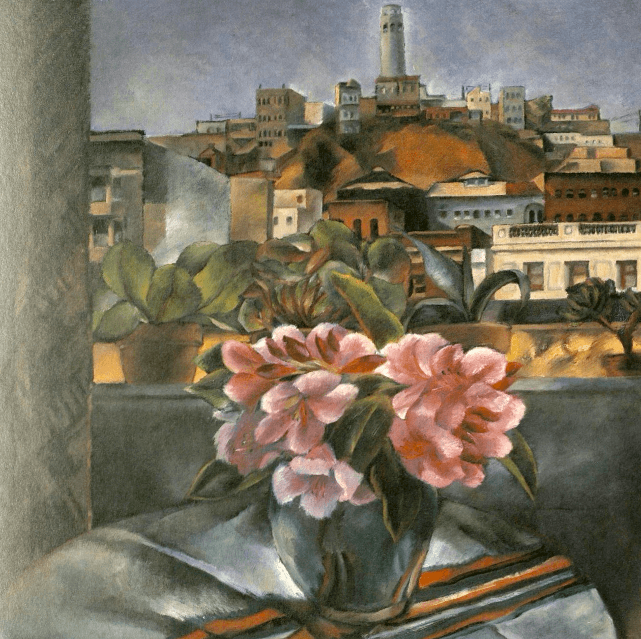 All three worked in a Western and realistic manner early on—Hibi depicting buildings and landscapes around her home in Hayward, Hayakawa producing skilled paintings of nude models— volumetric, muted fauve color, in a cubist/art deco/Bloomsbury blend of style, eschewing the coy salaciousness of a Tamara de Lempicka. A couple of loose portrait sketches of children are eerily evocative of expressive Alice Neel portraits. From my Window, a 1935 oil on canvas, currently on loan to the Huntington Art Museum, depicts with cubistic flattening a vase of flowers against a window with Coit Tower and Telegraph Hill looming in the background.