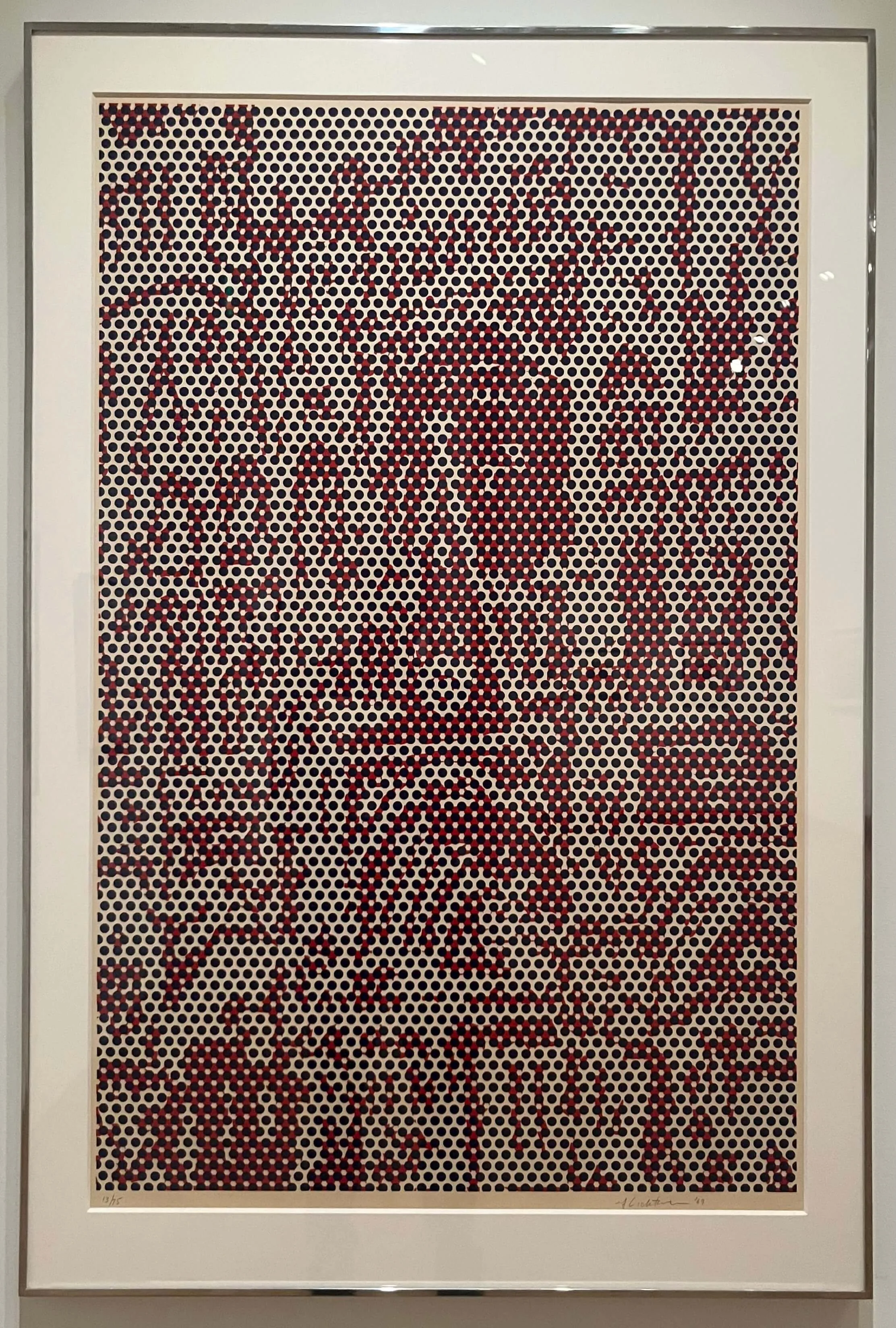 The show’s prints are interconnected beyond the thread of timeline and evolution. Any viewer can find some of these ties for themself, like finding “Thiebaud” scratched in paint. Others require some background. For example, Tadashi Toda, the same Japanese printing master frustrated by Thiebaud’s smoke (not in this show), was also responsible for a work that is here, Alex Katz’s The Green Cap. This brilliantly colored woodcut of a woman in a swim cap has broad areas of almost uniform color, balanced with subtle shading that echoes a Katz painting. The show’s interpretive signage calls the woodcut a collaborative effort between Katz and Toda, who were working in Kyoto with Rezo Monjyu, a block carver. Their skill at translating Katz’s vision is perhaps at its apex in the woman’s delicate eyelashes, printed in a semitransparent white.