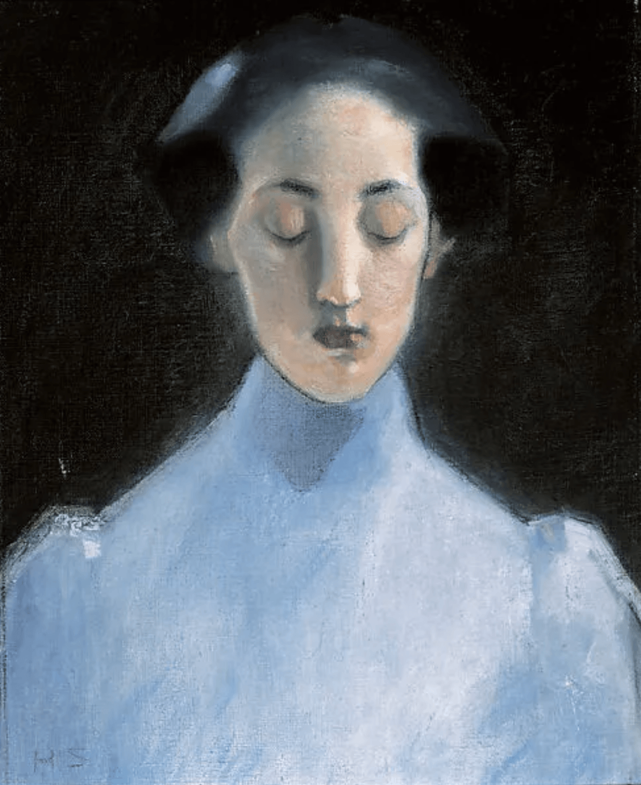 To see Schjerfbeck’s silence, one might turn to her work Silence (1907). The sitter in the painting wears a compact updo and a blue turtleneck dress. Her gaze directs downward, or perhaps her eyes are even closed. From outside the picture plane on the proper left, a source of light casts a layer of aura around her that illuminates against the pitch-dark backdrop. Her silence is indeed loud, but what accounts for it? For one, she appears almost static. There is a sense of contemplation, if not piousness, in her, and the luminosity further obscures her silhouette and therefore insulates her from us. From a formalist standpoint, her spirituality and silence are achieved through the palette Schjerfbeck applied to the picture: cold, reduced, and flat—reminiscent of the typical “Nordic aesthetic.” The quiet and simple visual quality with minimized visual noises translates the aural silence to visual silence.