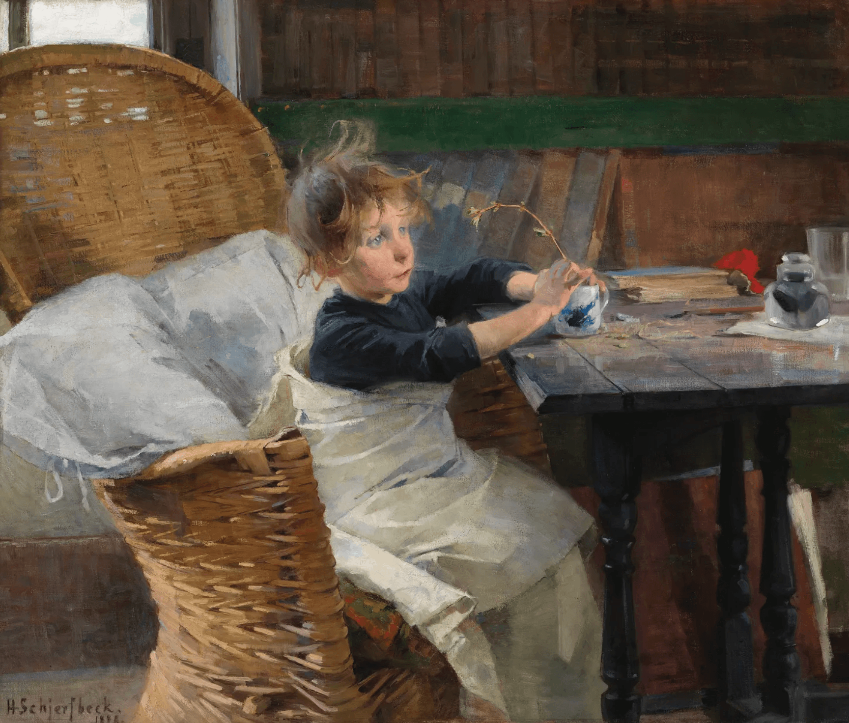 In The Convalescent (1888), arguably one of the most famous works of hers if not of any Finnish artists, the influence from contemporaneous French realists and naturalists like Jules Breton (1827–1906) and Jules Bastien-Lepage (1848–1884) is evident. The painting was featured in the Finnish pavilion (then still under Russia’s rule) at the 1889 Exposition Universelle in Paris and won Schjerfbeck a bronze medal. Here Schjerfbeck adopted the “sick girl” motif common in nineteenth-century Nordic art, which could have been a reaction to the distress looming over fin-de-siècle Europe catalyzed by urbanism and the rampage of tuberculosis. The Convalescent has long been considered autobiographical, mirroring Schjerfbeck’s childhood injury which led to lifelong disability. Nonetheless, despite the rosy cheeks and dazed blue eyes possibly resulting from fever, the disheveled and swaddled child clearly shows signs of recovery. Visually much busier than her later works, the picture retains peace and serenity brought by a sense of hope.