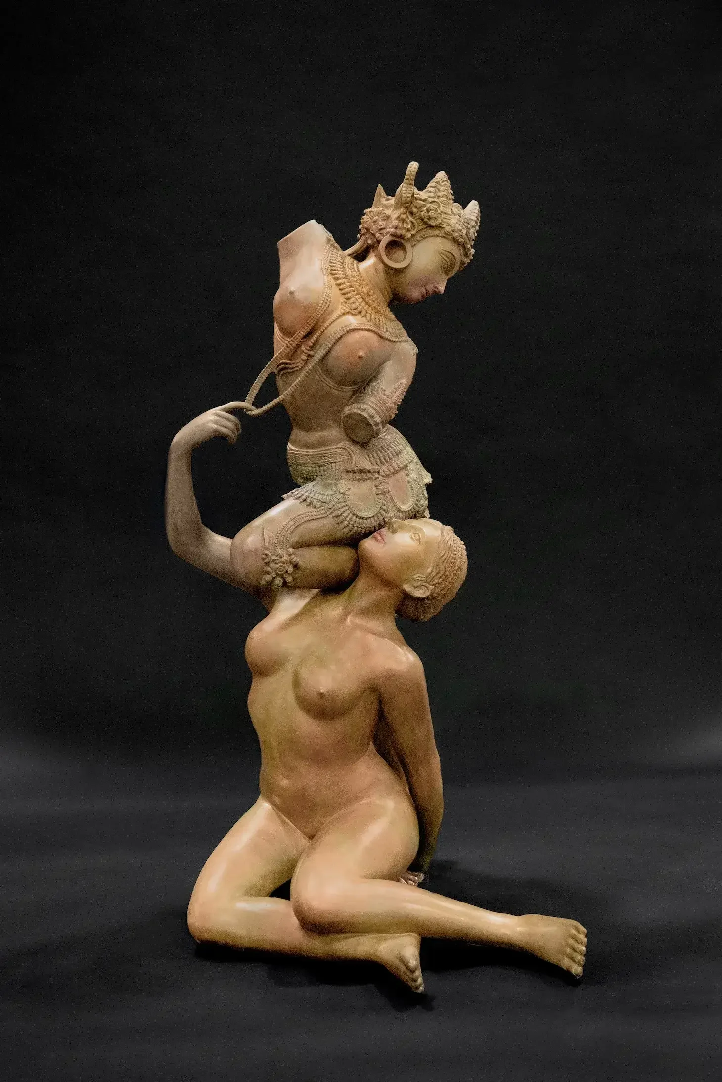 The syncretic cross-referencing of multiple mythic traditions that one finds in her works on paper is not just a playful way to reflect on the multiple faces of the gods over the course of human civilizations, but a means of exploring the artist’s own physical and spiritual wanderings through present and historic worlds. There are myriad manifestations that encounter one another in her images. The longstanding quest for the divine is here, but so also is contemporary migration and historical colonialism, and the role of women across time and cultures. We not only understand the concepts, but we also perceive the traces in her work of a world held in delicate balance. Consider the recent mixed media collage Weightless (2024). Here one sees the legless female form twice—on the right, she is perched on a lotus blossom and, in the center, perhaps carried on the back of a turtle (some Native American myths conceive of the Americas as Turtle Island). Or perhaps, she is in the process of transforming into a turtle, for the turtle’s head takes the place of the figure’s. The turtle is swimming across a page filled with Gopis (a hair form that the artist has long used, taken from the female worshippers of Krishna from traditional Hindu painting). These Gopi forms are disembodied and transformed into grey shapes that the turtle seems to navigate. Or perhaps it is not swimming but flying. The image is framed by a decorative botanic motif, like a page from a manuscript, but blue forms that could be clouds or dragons float around the border between image and frame, complicating the figure/ground relationship.
