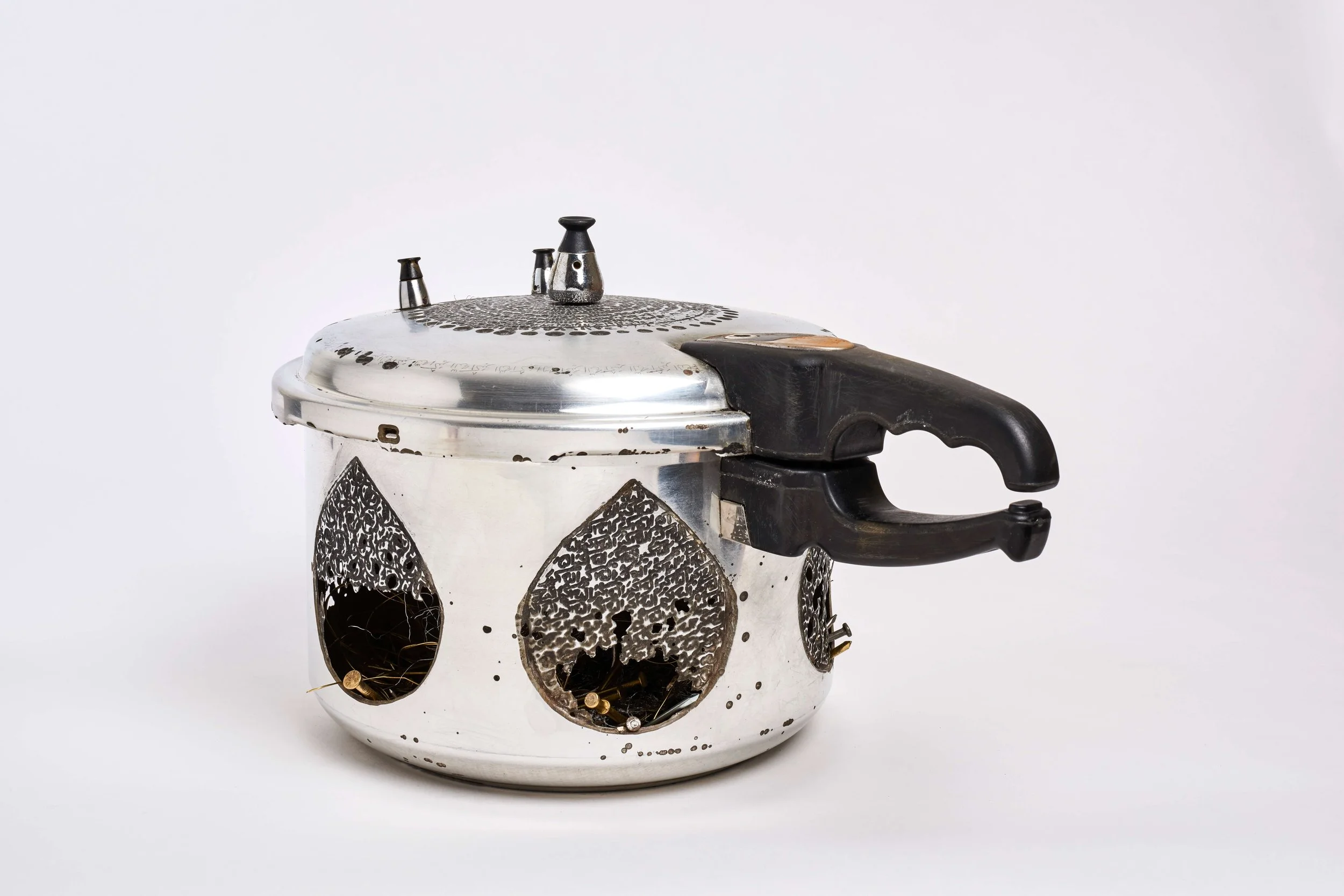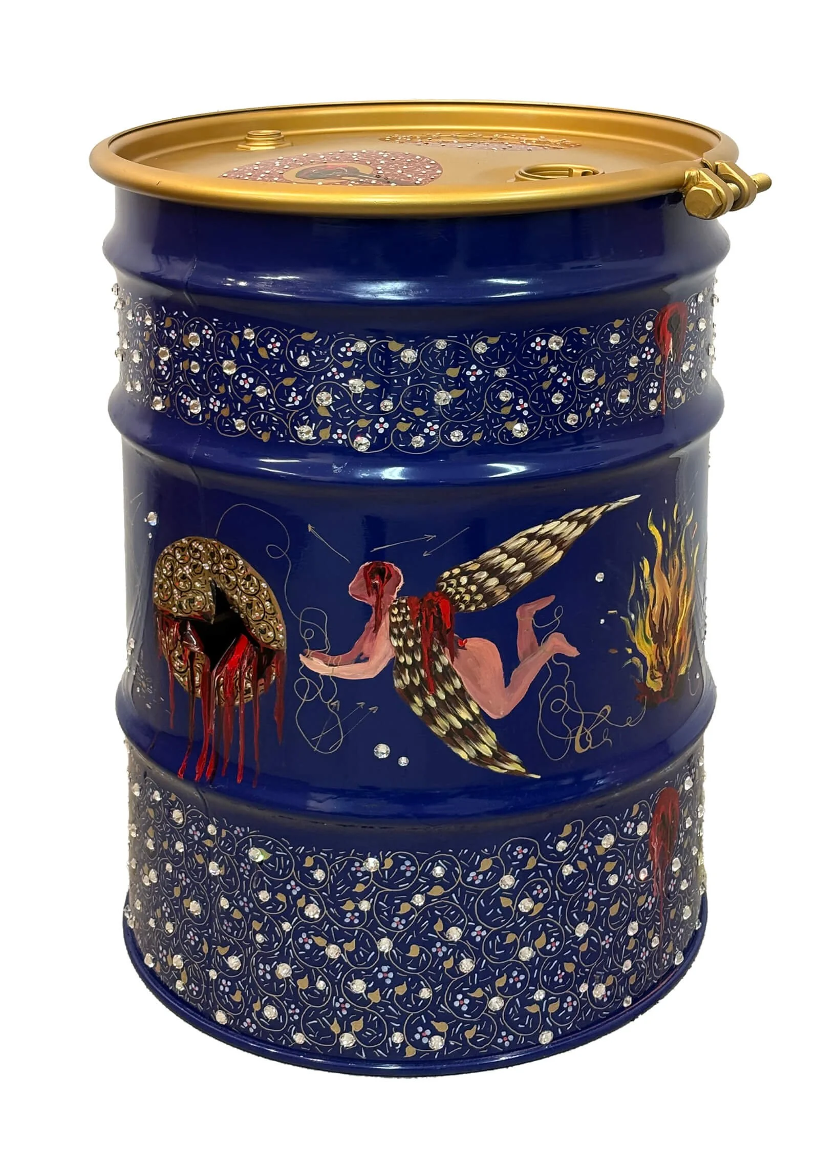 Like that one, Crown of Flames features large, everyday objects that she has sculpted into symbols of greed and terror, like her new work called "Oil Barrel #32." Oil's role in people's lives has been a central theme in Ahmadi's art for 30 years, and "Oil Barrel #32" is a real barrel that Ahmadi festooned with glittering crystals, a gold top, figures of women, and holes that look like they emerged from violent means. Painted pools of blood pour out onto the barrel's Persian blue surface. What is at first strikingly alluring becomes, on closer inspection, an entry point into a perception of depth and death. This thin line between beauty and betrayal is one that Crown of Flames highlights in every artwork. Visitors to Haines Gallery don't need to ask Ahmadi questions about that. Through her art, Ahmadi addresses that topic for everyone to see.