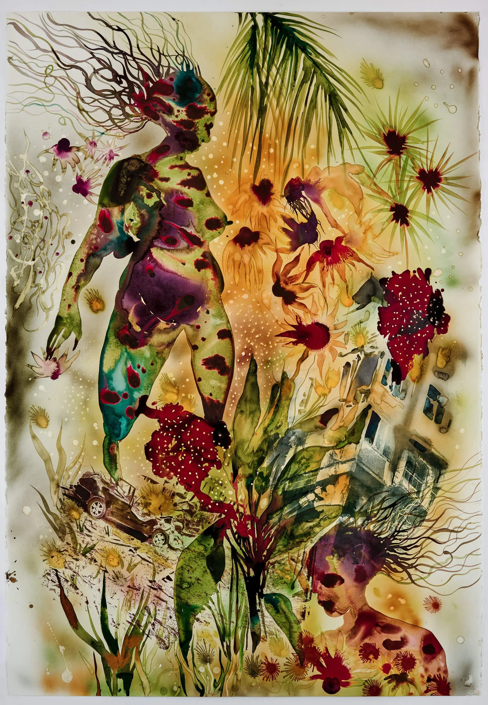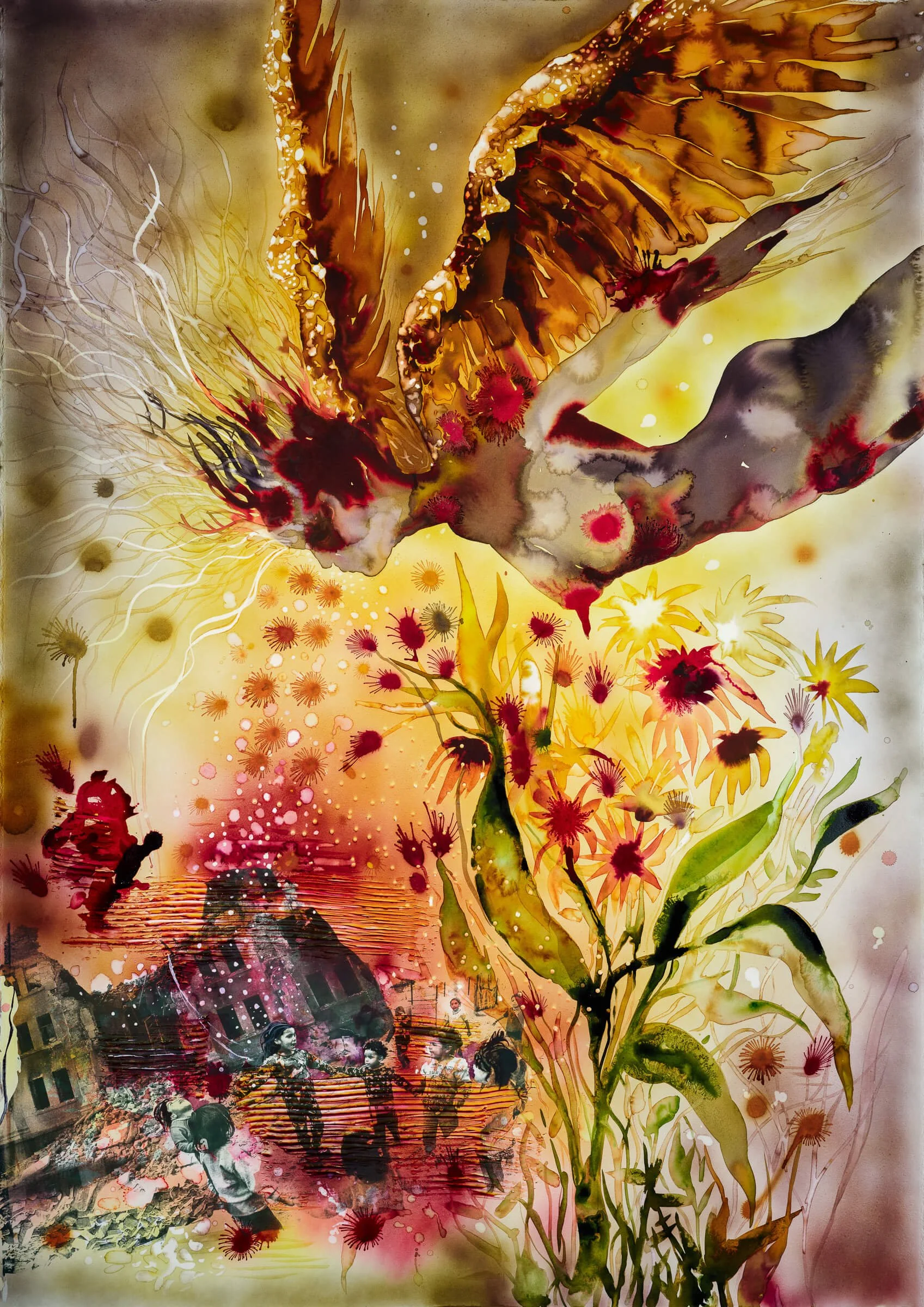 If Ahmadi's animation is the exhibit's centerpiece (Haines has cordoned off a gallery space just for its viewing), then the five-foot-tall watercolor painting called "Fiery Descent" is the exhibit's labyrinthian masterwork. One way to think of it: As a giant jigsaw puzzle with individual scenes or "pieces" that come together to form a bigger narrative of beauty, resilience, and tragedy. The top section features a winged female whose outstretched feathers are saturated with colors that resemble a leopard fur coat — which complements the background's gold and yellow, Klimt-like colors that bathe the figure's seemingly-bloodstained body with a giant patina of celestial sunlight. Flowers bloom from the painting's lower-right scene, but "Fiery Descent" is anchored by the lower-left scene that has children playing amid bombed-out structures. But even this scene requires three or four looks since Ahmadi has painted different grids across the children and the bombed-out structures. The wavy panels of yellows, reds, and charcoals give this section another dimension — prettier than the scene would be otherwise, and creating a labyrinth within a labyrinth, as if the children are in a dream space within the rubble, where they can be free of worries as they play their momentary game of hand-holding.