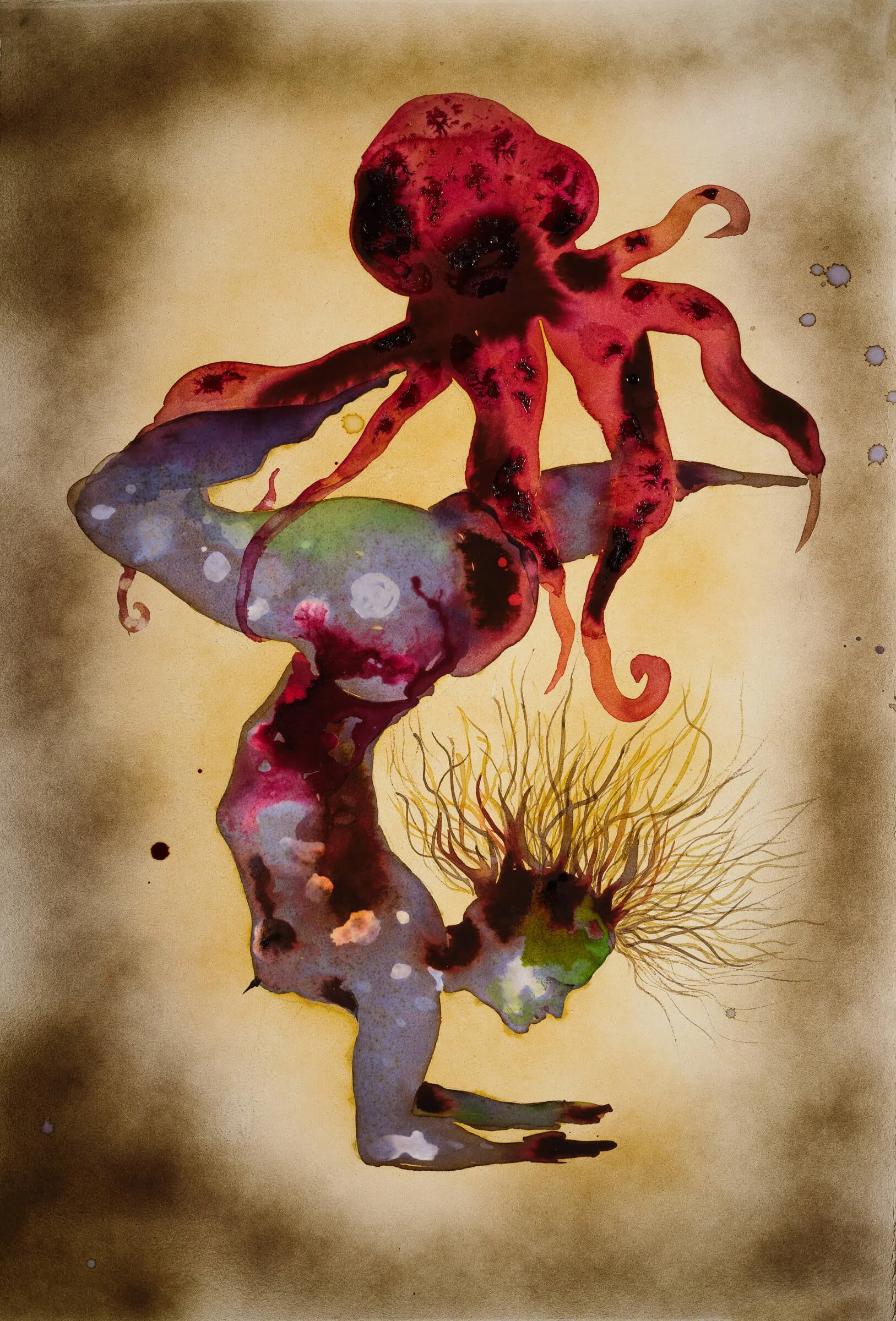 An irony: No men are really pictured in Crown of Flames. None. Instead, Ahmadi has centered female figures throughout the exhibit's stunning artwork, freeze-framing them into contorted positions of free-fall or having them float amid objects and creatures that spiral with them. And yet: On the exhibit's opening night, it was a lineup of men — the United States' current male president, and Iran's entire clerical regime of men — who were on the minds of many attendees, prompting them to pepper Ahmadi with news-oriented comments about "how timely your exhibit is!" The interlude temporarily overshadowed what for Ahmadi is an exhibit whose truths extend far beyond a single war and a single country.