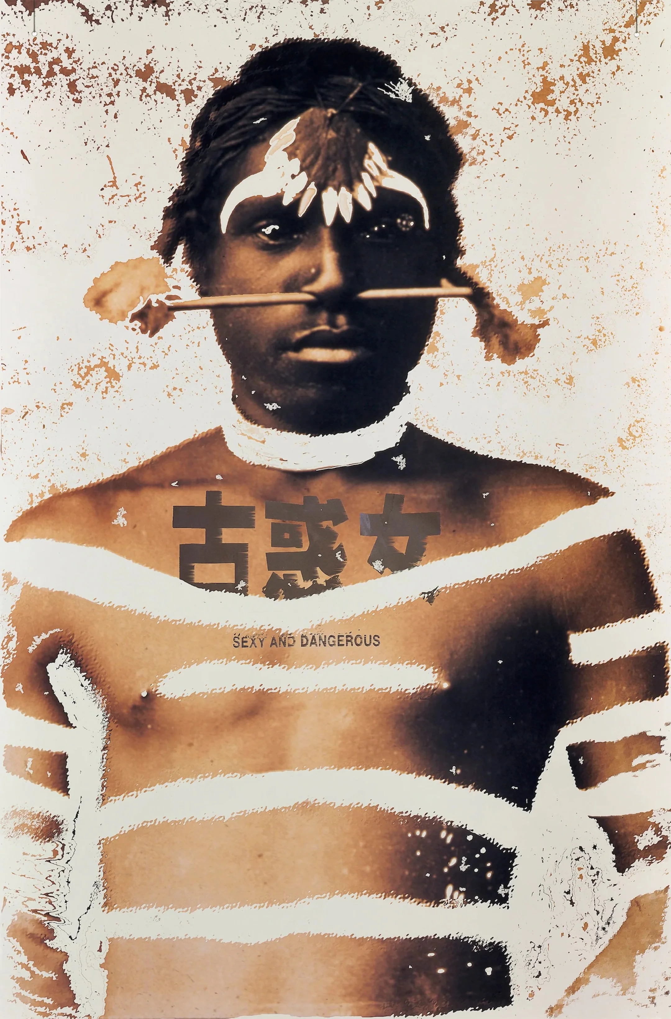 Brook Andrew’s “Sexy and Dangerous,” 1996, is a manipulated photo from the early 20th century of an Aboriginal man. The original picture, taken to reveal Australia’s exotic inhabitants to the world, was part of a sideshow of colonization, or the “settlers’ exploitation” of the people they subjugated. The catalog explains that Andrew reaffirms the subject’s real identity and turns the man’s powerful gaze back to the viewer. Andrew says, “We are sexy and dangerous.”