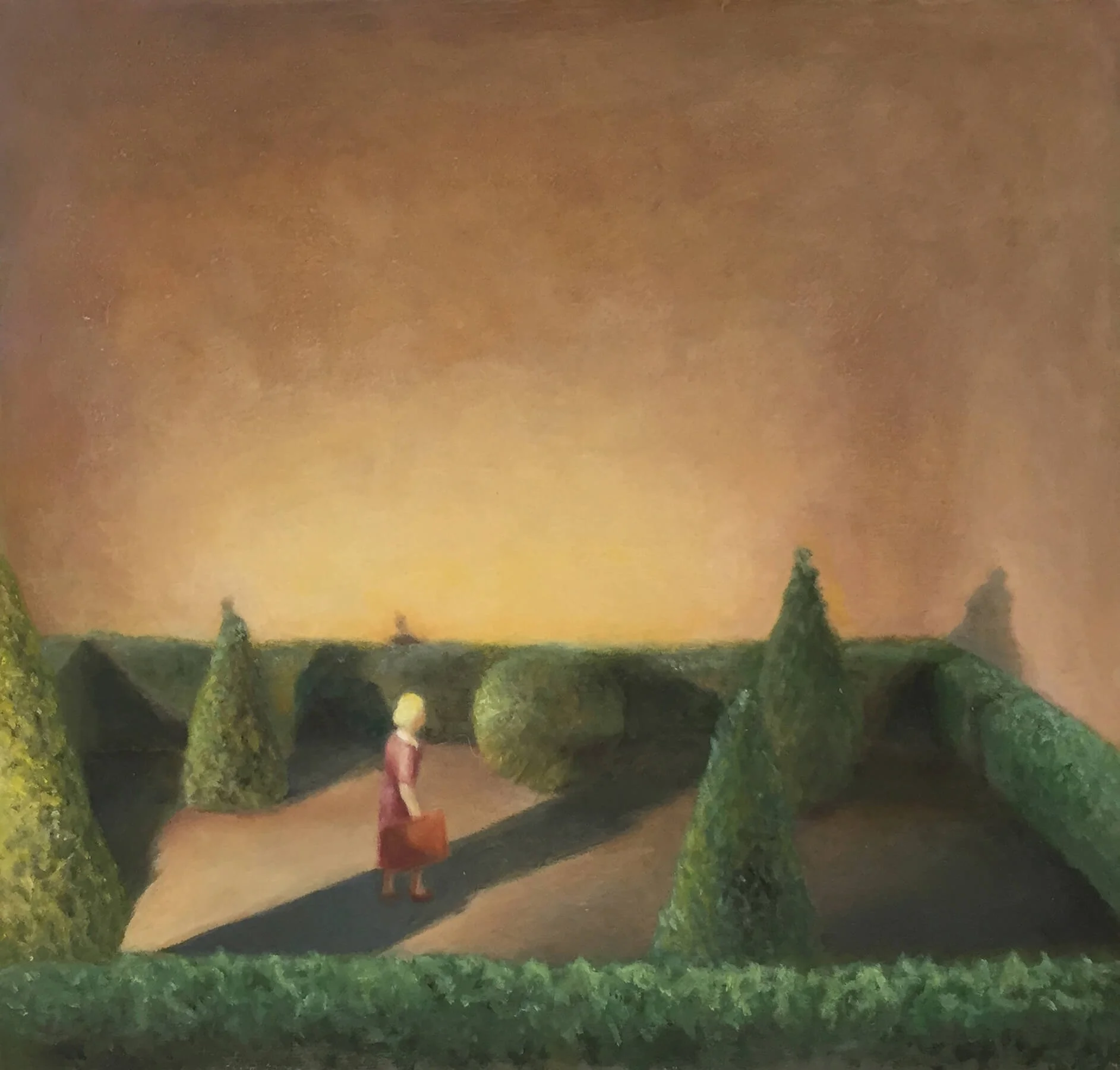 The Hedges shows a woman with her luggage in an enclosed garden bordered by bright green hedges. The style of her dress is old fashioned. The saturated yellow color of the sky creates a strange unearthly light. There are shadows lurking outside the boundaries of the garden that seem ominous. Gallery owner Susan Aulik noted that the woman in In the Hedges seems like she is entering a labyrinth where circumambulating the pathways can lead to a state of meditation, or it can be a perplexing complex of dead endings and passageways with no way out.